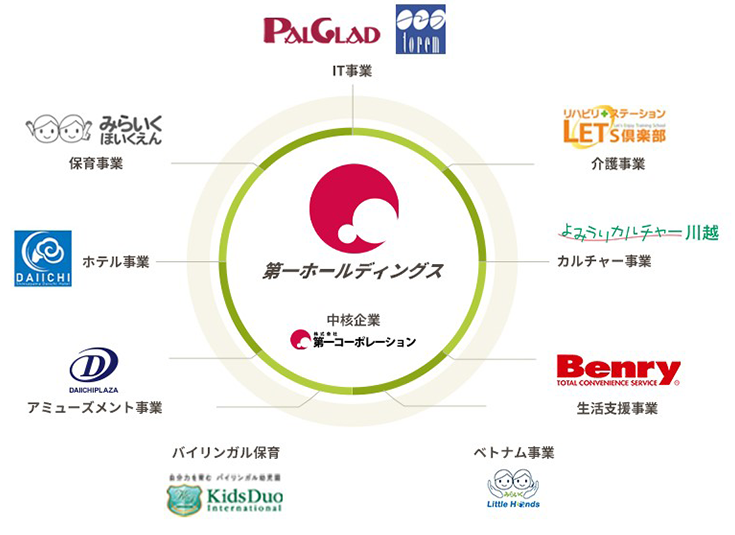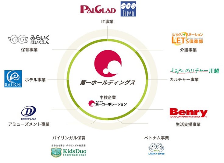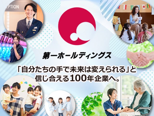 株式会社第一ホールディングス (【本社】 埼玉県狭山市【本部】 埼玉県川越市 代表取締役社長:西井 直人 以下当社)は、地域の毎日に寄り添い、アミューズメント施設やビジネスホテル、カルチャースクール、保育・介護施設など多彩な事業を通じて、豊かな暮らしを育む100年企業を目指しています。時代の変化に応じて必要とされる事業を、地域とともに展開しています。