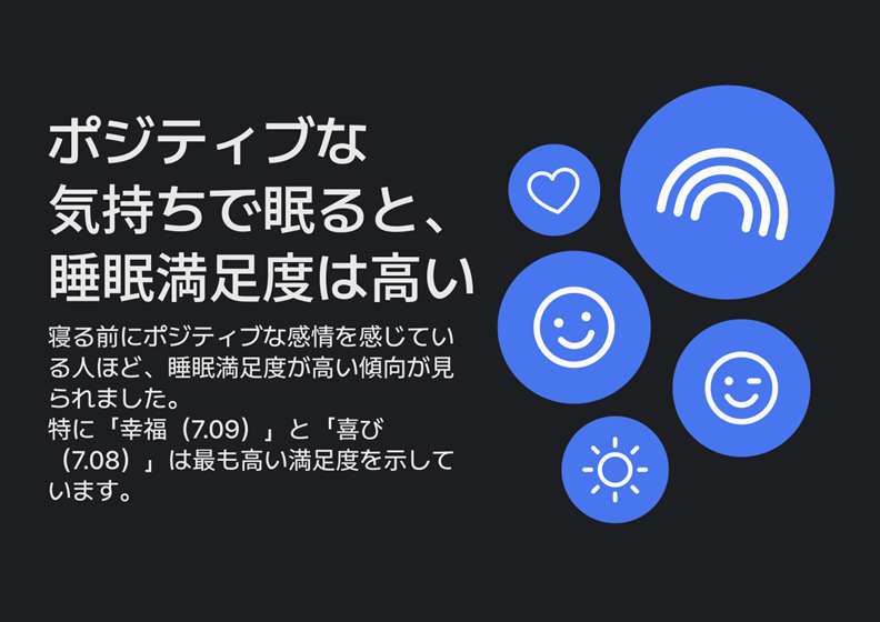 ポジティブな感情の満足度は 7.09、憂うつな状態では 6.28 と、0.81点の差が見られました。これは 睡眠時間約2時間分に相当します。就寝前に感謝していることを思い浮かべるなど、気持ちを落ち着ける習慣も効果的です。