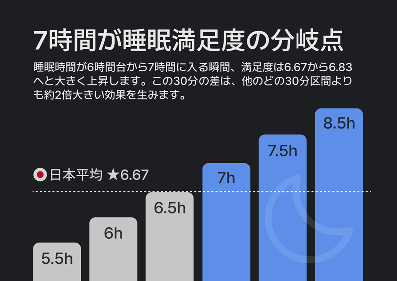 日本人ユーザーの多くは6〜7時台に起床していますが、この時間帯の満足度は平均を下回っています。これは、早く起きるほど睡眠時間が短くなりやすいことが影響していると考えられます。