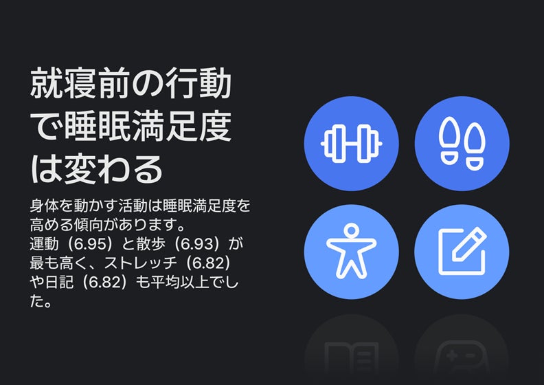 就寝前の活動の中で、運動(6.95)と散歩(6.93)は睡眠満足度が最も高い結果となりました。