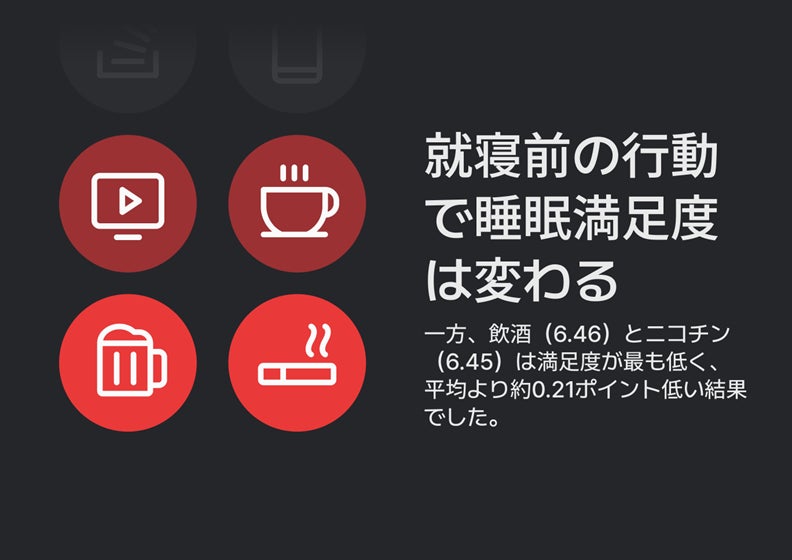 また、カフェインは睡眠時間を平均より15分短くする傾向が見られました。さらに、ニコチンを摂取するユーザーは平均より遅い午前1時30分頃に就寝する傾向があり、睡眠満足度も6.45と最も低い結果となりました。