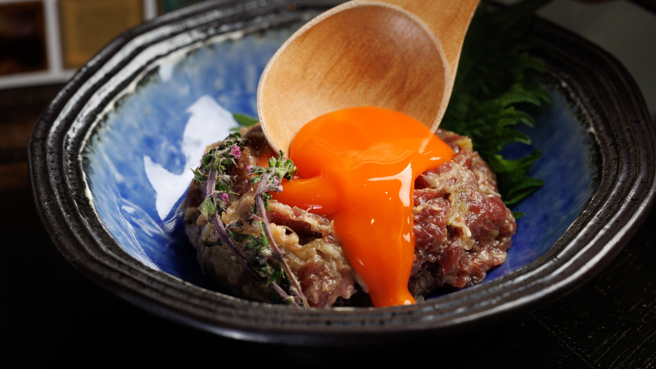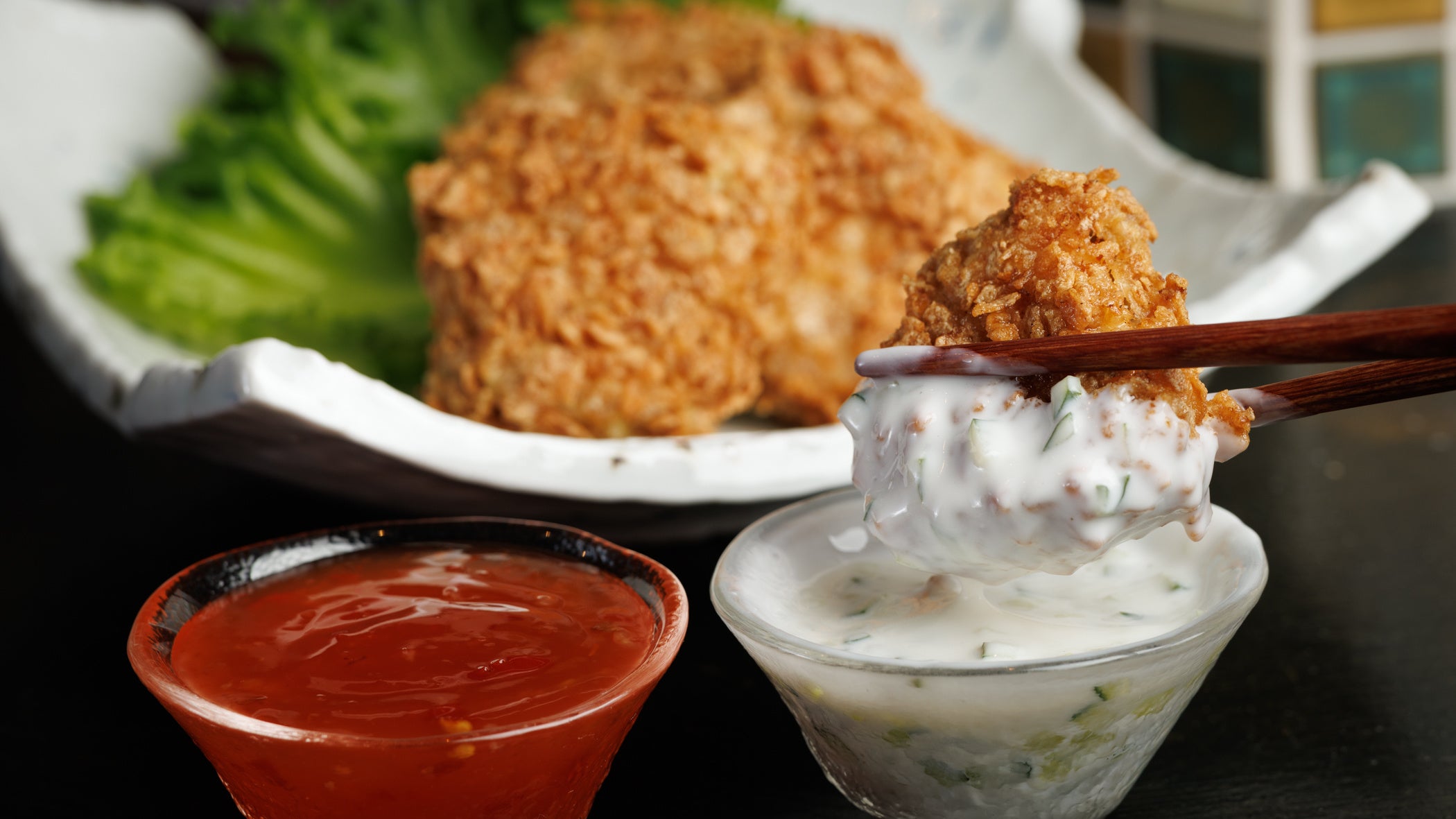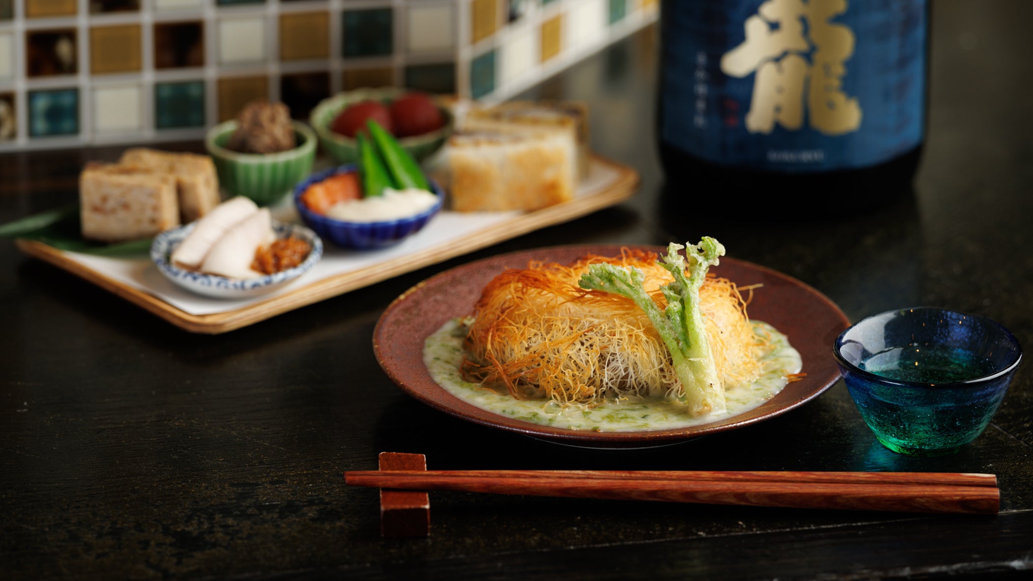 西京味噌の深いコクを纏ったサーモンに、極細の麺「カダイフ」を巻き付けてサクサクに焼き上げた一品。磯の香り豊かな生のりクリームソースが、食感のコントラストを引き立てます。