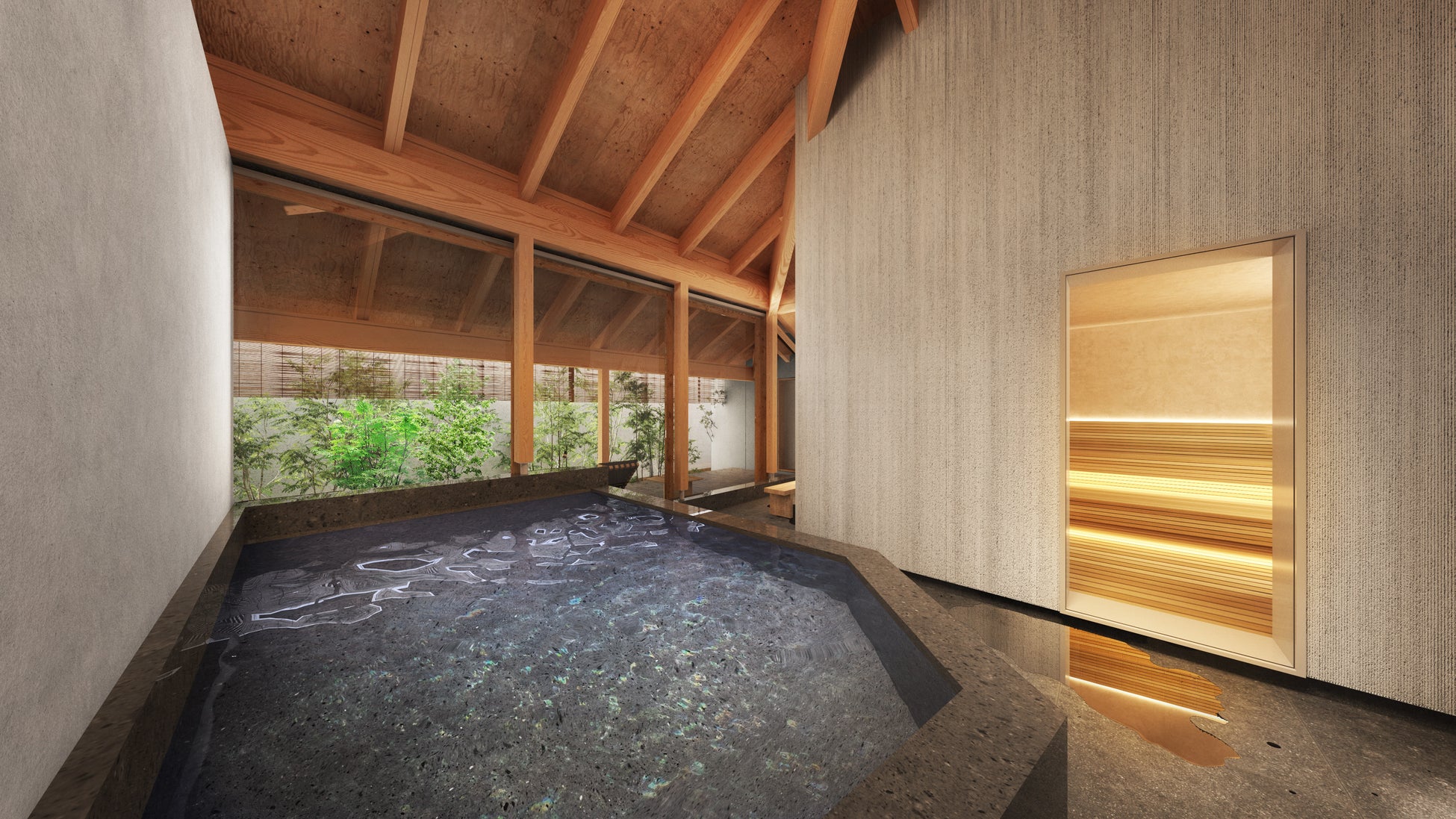 ・贅沢なゆとりの水風呂: 大人4名が同時に、肩までゆったりと身を委ねられる開放感あふれる設計。高性能チラーを導入することで、季節を問わず理想的な水温(15度)を常にキープします。複数人が同時に入っても温度が変化しにくい抜群の安定性を追求し、血管の収縮と拡張を促す質の高い温冷交代浴を、心ゆくまでご堪能いただけます。