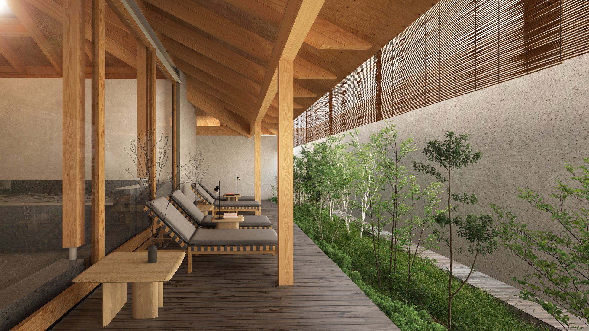 ・信州の自然を五感で味わう外気浴:信州の心地よい風をダイレクトに感じられるよう、設計の段階から空気の流れを緻密に計算しました。シラカバやシラカシ、ソヨゴなど長野の原風景を思わせる瑞々しい木々や、アサギリソウ、ギボウシが彩る景色は、まさに日常の喧騒を忘れさせる空間へと仕立て上げました。