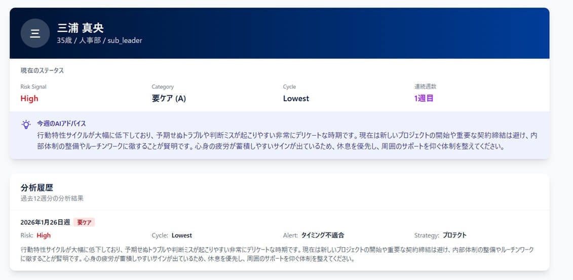 週ごとに変動する「個人の調子の波」に合わせた、最適な接し方のアドバイス「今動くと損をする」タイミングを捉え、不幸な意思決定を未然に防ぐアラート適切なタイミングでの介入による、会社(定着)と個人(キャリア)の利益最大化最適な接し方のアドバイスタイミングや意識を忘れないよう人事担当へメールでも通知