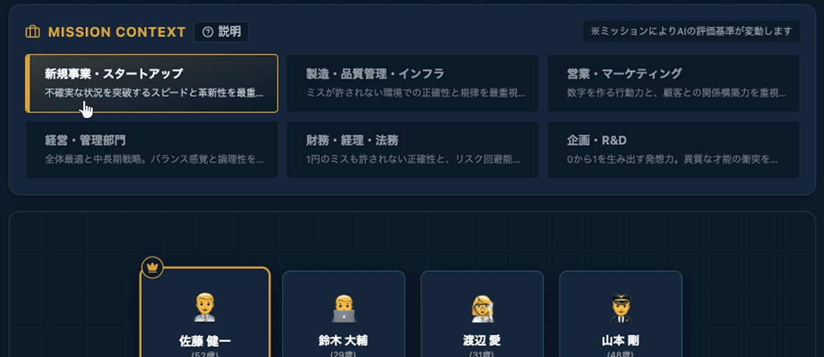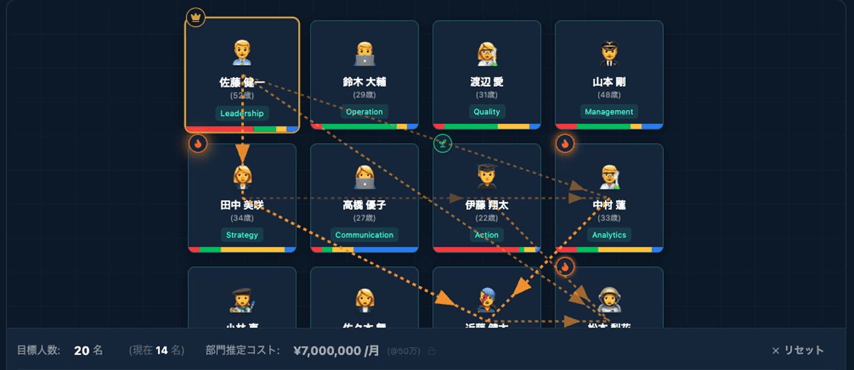 RPGのパーティ編成のように、メンバーカードをドラッグ&ドロップするだけで、チームの相性をリアルタイムに判定。