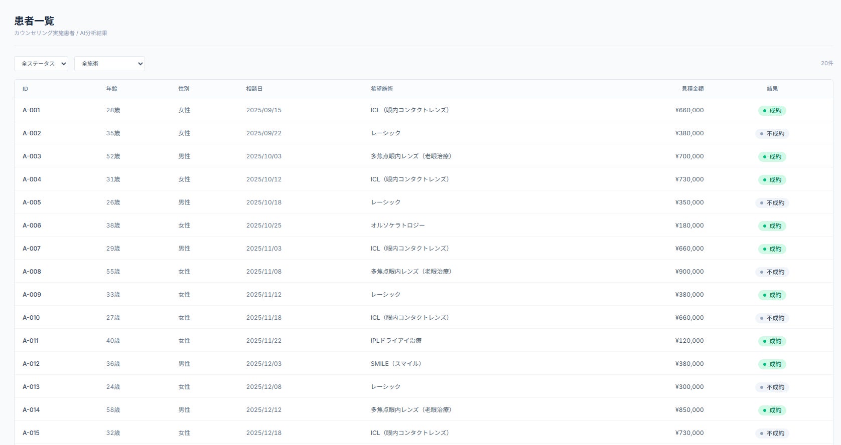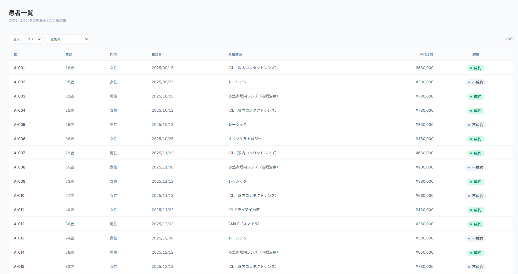 そこで本サービスでは、AIがカウンセリング内容を分析し、成約要因・未成約要因を自動で分類・一覧化します。さらに、未成約理由のランキング表示、担当者別の傾向比較、患者属性別のクロス集計、録音分析サマリー、改善アクション候補の提示などを通じて、現場改善に活用しやすい形で情報を整理します。