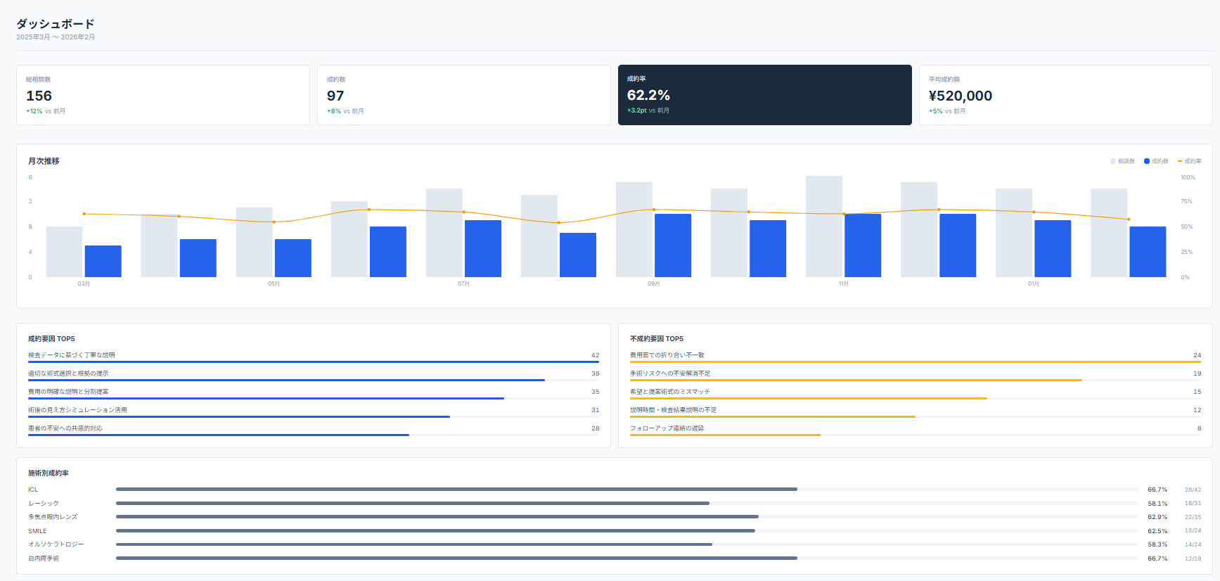 自由診療の現場では、「なぜ成約したのか」「なぜ未成約になったのか」が担当者ごとの感覚に留まりやすく、施術別・担当者別の傾向が十分に見えないまま改善活動が進められているケースも少なくありません。