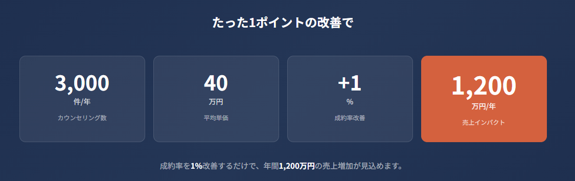 また、年間3,000件のカウンセリング、平均単価40万円のケースで、成約率が1ポイント改善した場合、年間1,200万円の売上インパクトが見込める試算例も紹介しています。