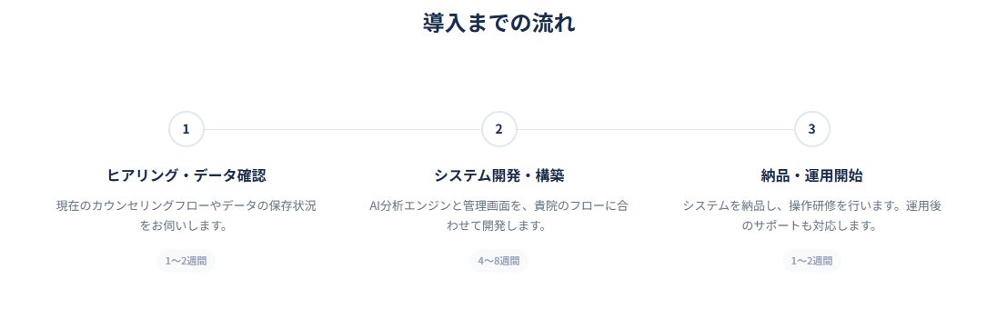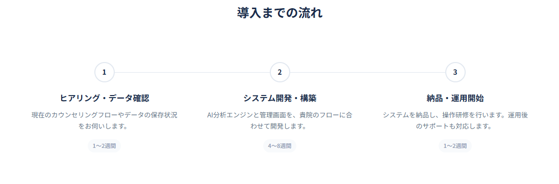 導入にあたっては、現在のカウンセリングフローやデータ保存状況を確認したうえで、各クリニックの運用に合わせてAI分析エンジンおよび管理画面を設計・開発します。