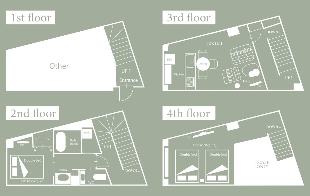 2ベッドルーム: 2Fと4Fに独立したベッドルームを備え、グループ内でもプライバシーを確保。女子会、家族旅行、卒業旅行、撮影利用など、幅広い用途に対応します。