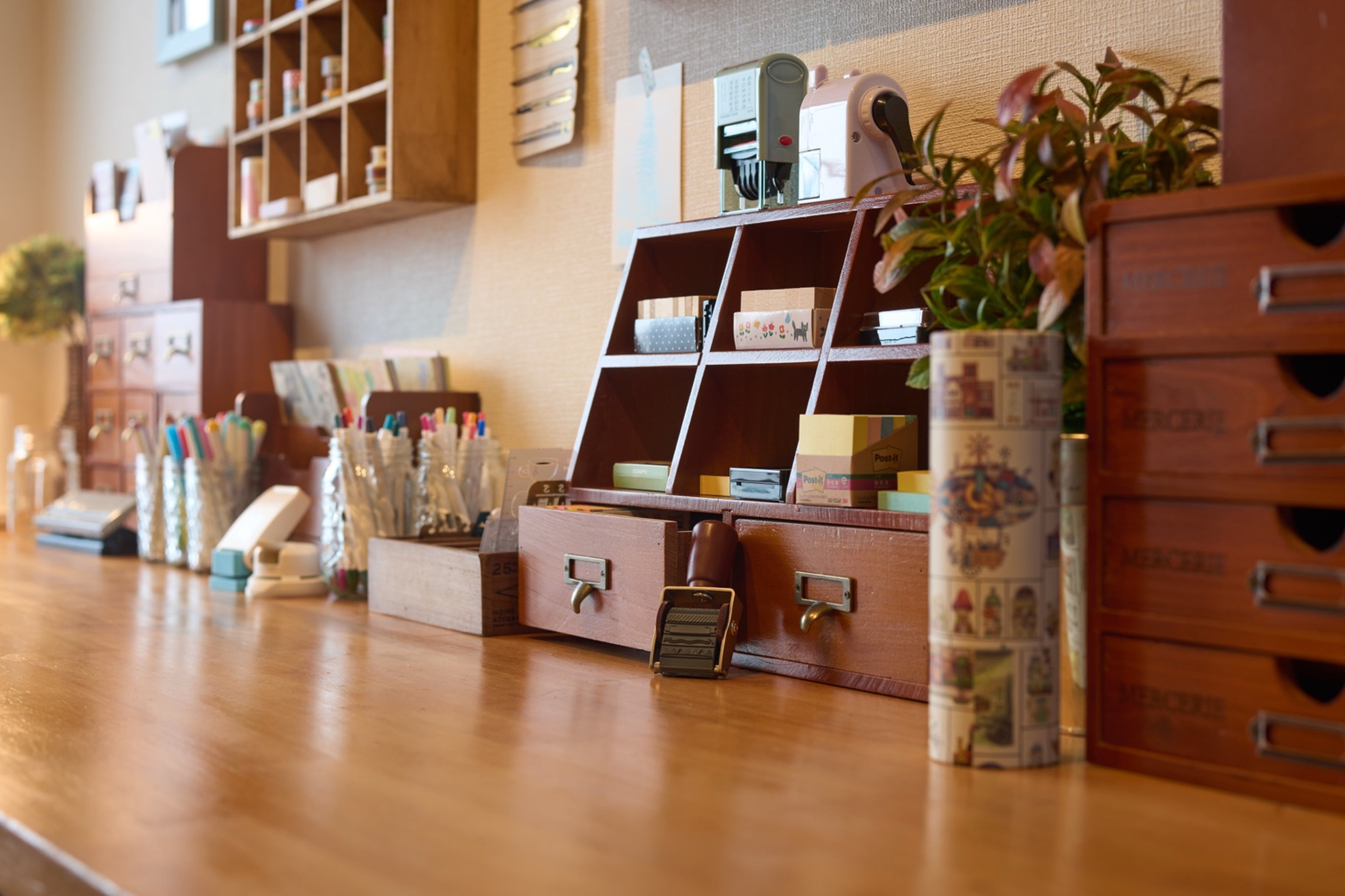 何十本ものペン、色鉛筆、マスキングテープ、スタンプなど、手帳関連の文房具をすべてその場で自由にお使いいただけます。 -
