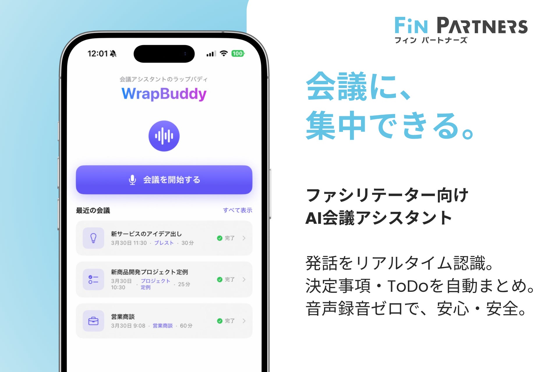 Fin Partners株式会社(本社:東京都港区、代表取締役:塩野隼也)は、ファシリテーター向けAI会議アシスタントアプリ「WrapBuddy(ラップバディ)」をApp Store(iOS)にて提供開始しました。