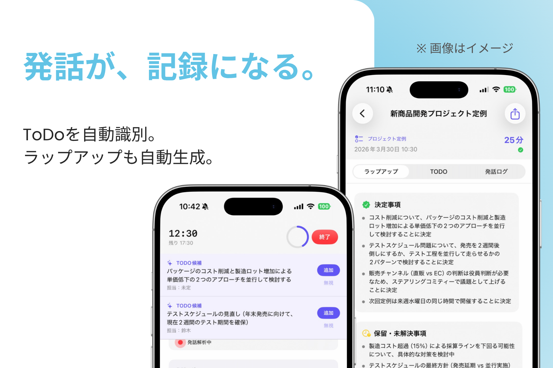 会議終了直前に、決定事項・保留事項・ToDoリスト・次回アジェンダを含むラップアップをAIが自動生成。会議後のまとめ作業を大幅に効率化します。