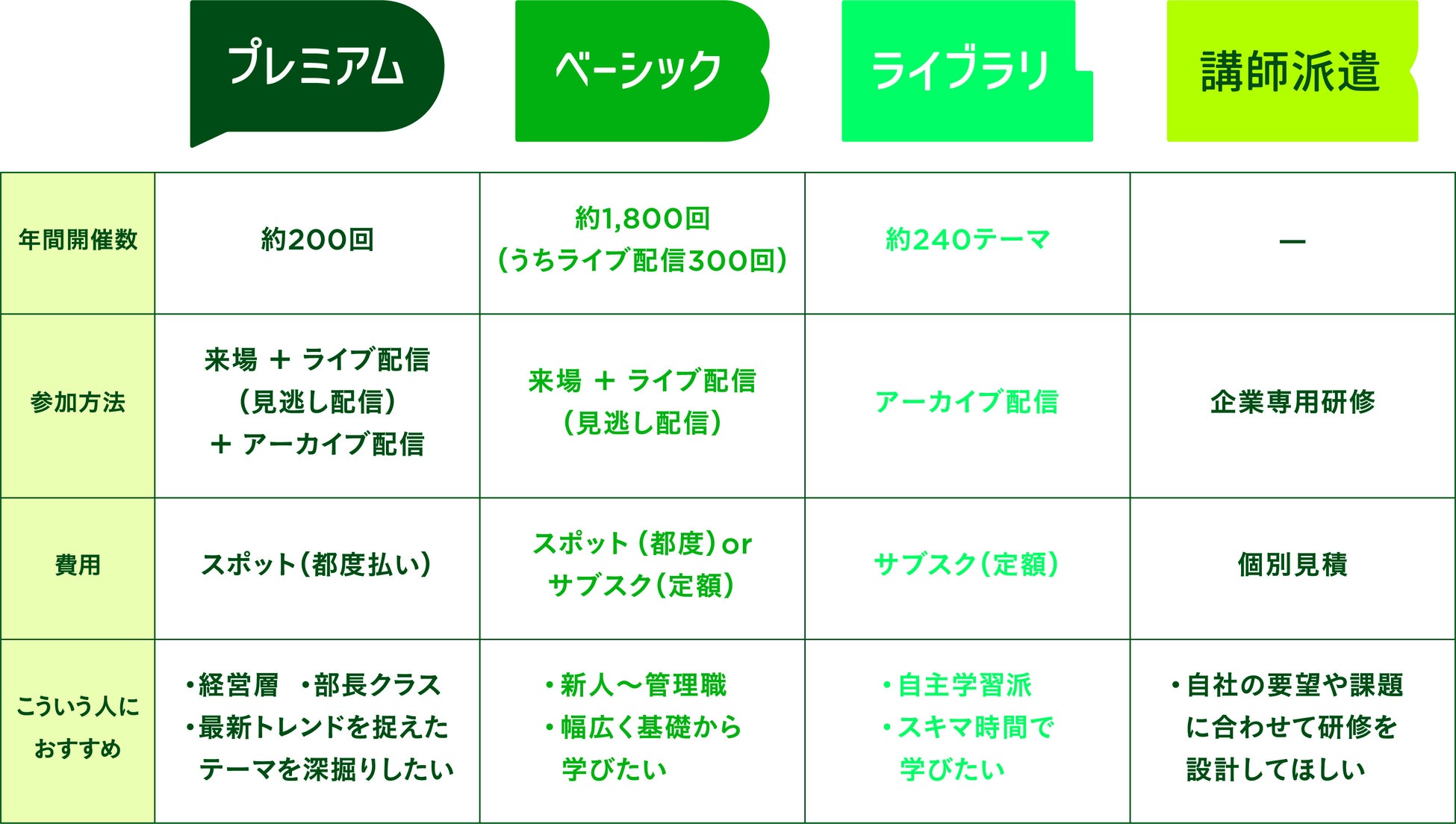 「ベーシック」では、来場型の対面研修をサブスクリプション形式で利用できるサービスを提供しています。企業が年間を通じて計画的に人材育成を進められる仕組みであり、約1,500回の対面研修と300回のライブ配信を定額制で受講できるサービスとして、国内屈指の規模となります。