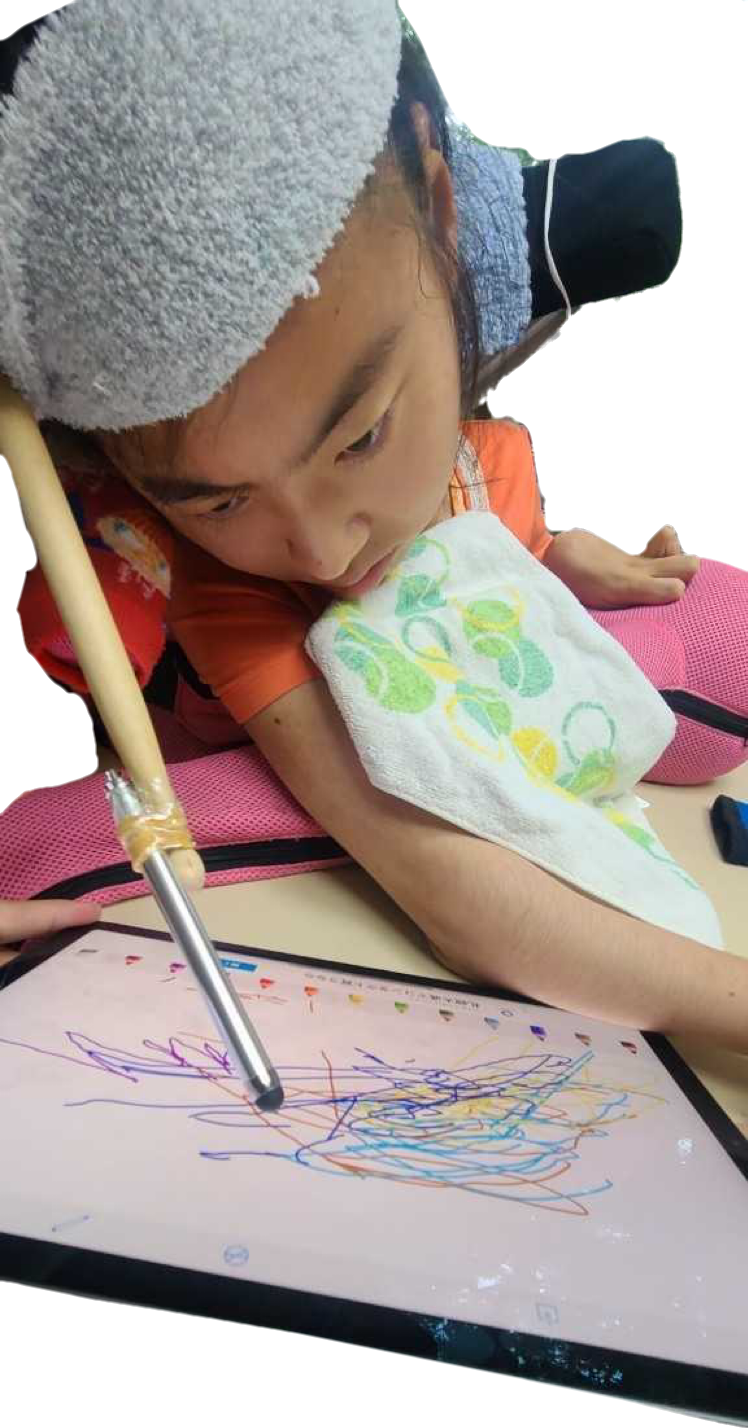 手に拘縮があり、筆などを手で握って描くことが難しいため、本人と相談して頭に筆をつけて描くことで、本人も自由に表現ができるようになりました。