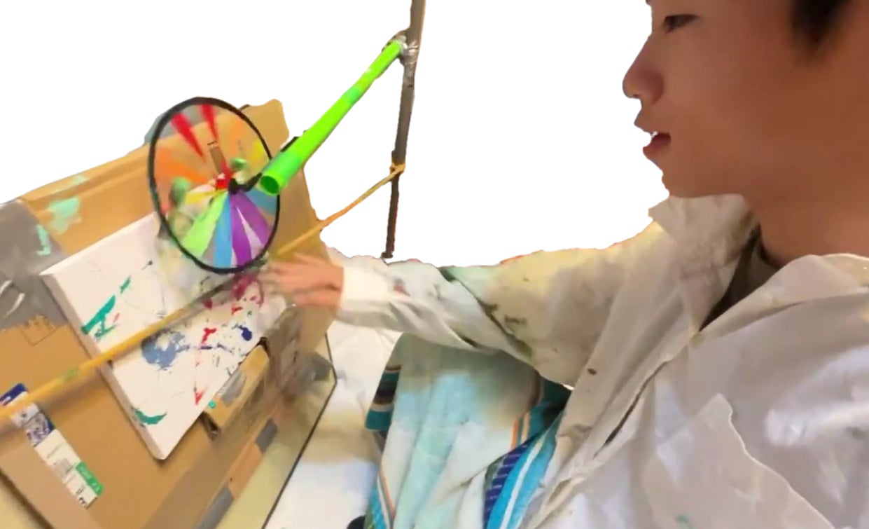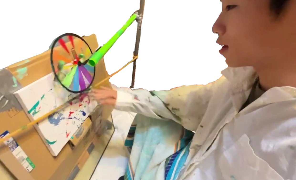 手で触る感触が特に好きで、手で絵具を混ぜたり、箱に入った画材と絵具を転がして色付けをしています。他にもゴムチューブを弾くなど道具を工夫して表現することもあります。