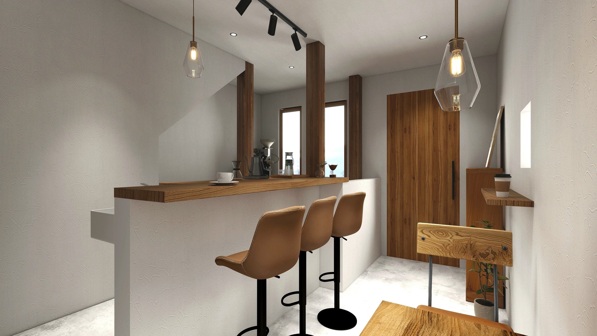 自伐型林業に携わる夫が焙煎するコーヒーを提供 。カウンター越しに会話が弾む設計にし、地域の憩いの場であるとともに、地域が抱える"山林の放置林化"や"担い手不足"といったの課題についても気軽に語り合える場を開きます。山をどうしたらいいかわからないという不安が、コーヒーを飲みながらの何気ない会話を通じて、少しずつ解きほぐされていく場を目指します。