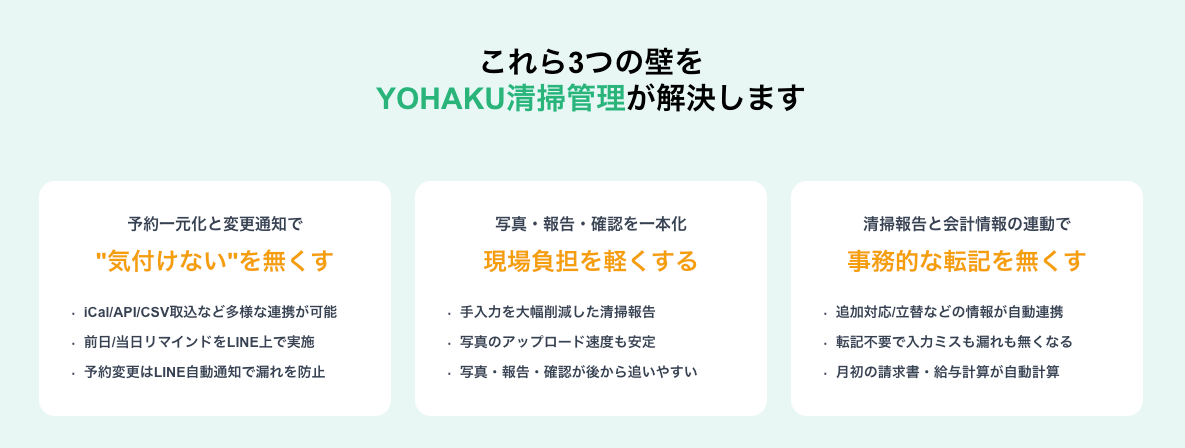 ■「YOHAKU清掃管理」が提供する、3つの解決アプローチ
