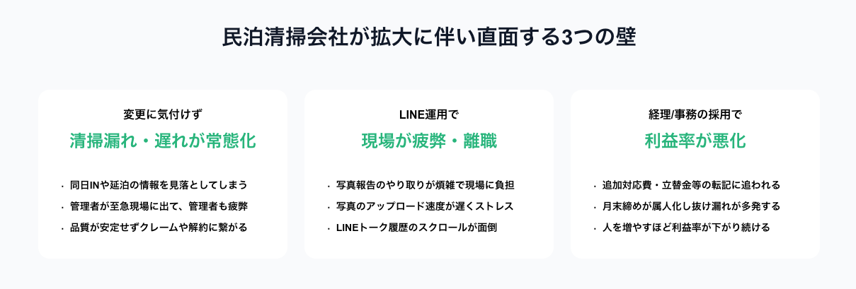 これら3つの課題は、現場の努力や採用強化では根本解決が困難な、拡大期の民泊清掃業界が抱える構造的問題です。