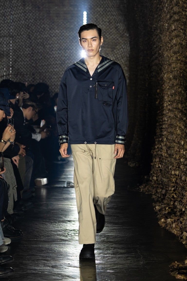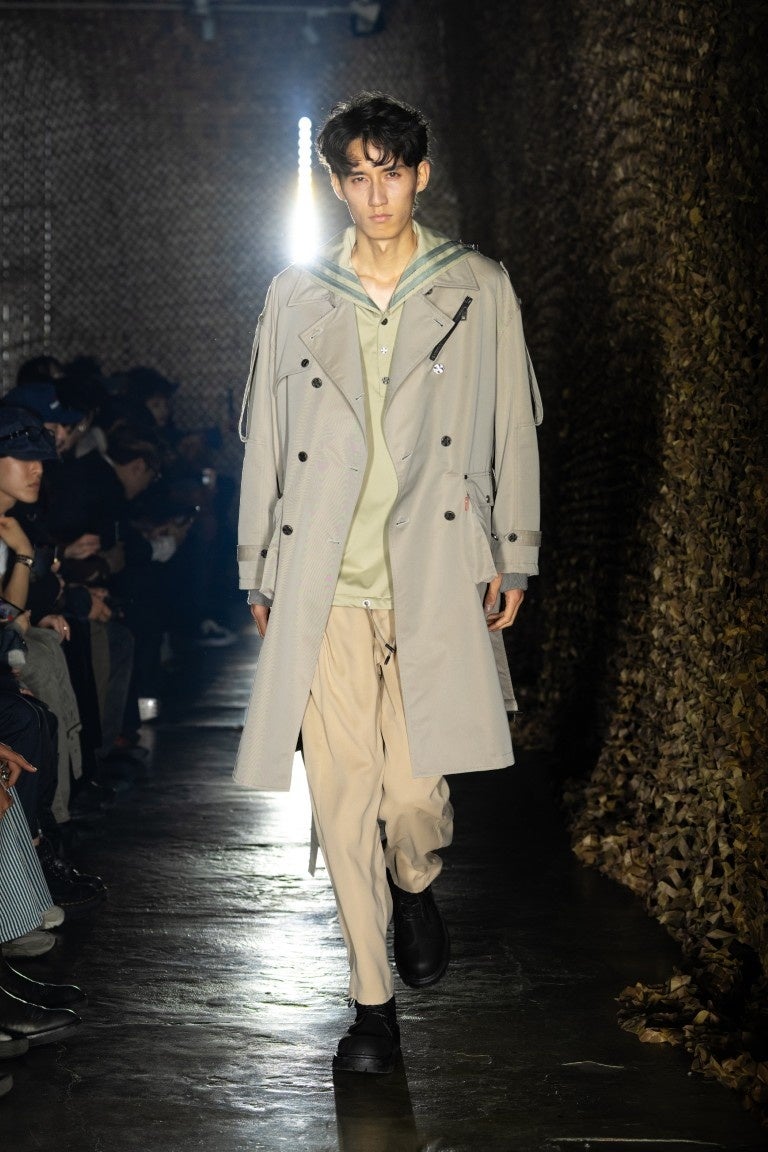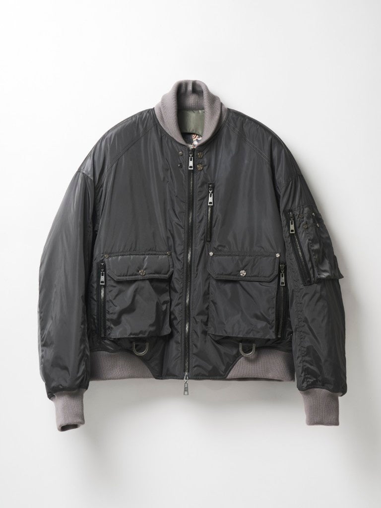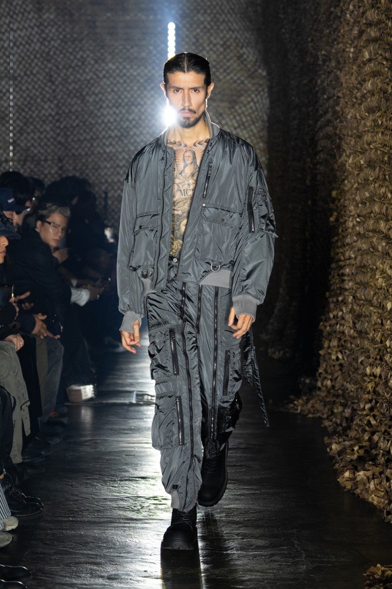 展開されるアウターには、ミリタリー由来のパラシュートベルトを搭載。着用時だけでなく、背負う動作によって裏地に施されたグラフィックが現れる仕様とするなど、機能性と視覚的表現を両立しています。