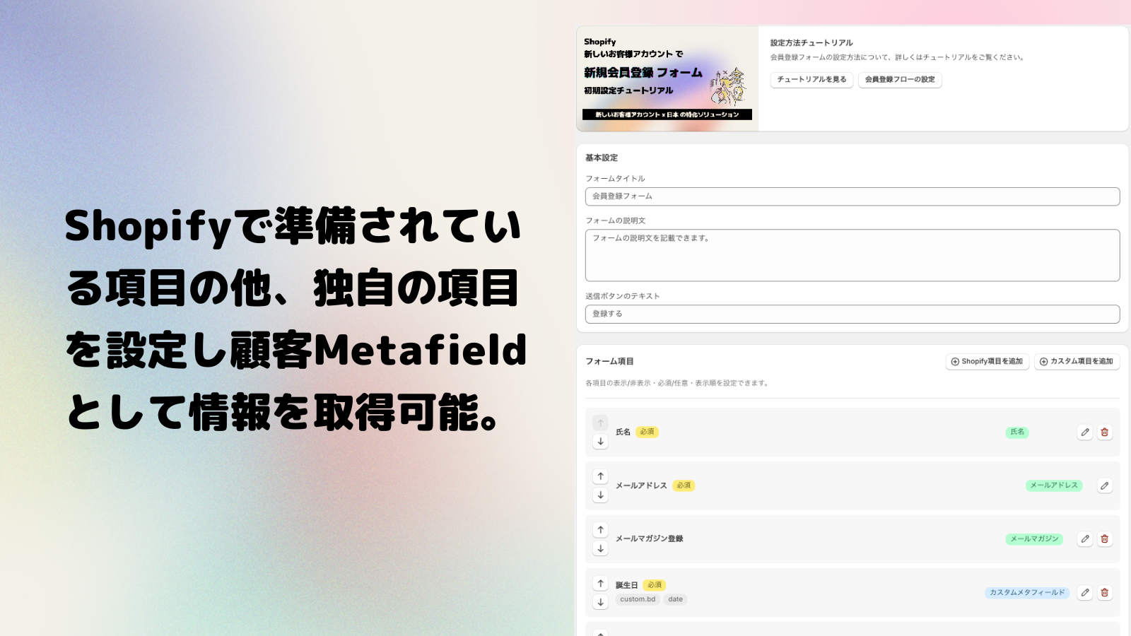 現在、会員登録フォームおよびプロフィールページ(マイページ)でのメタフィールド編集機能を提供しております。今後も他Shopifyアプリとの連携や日本に特化した機能の追加など、皆様のご要望に沿って継続した機能開発を進めます。