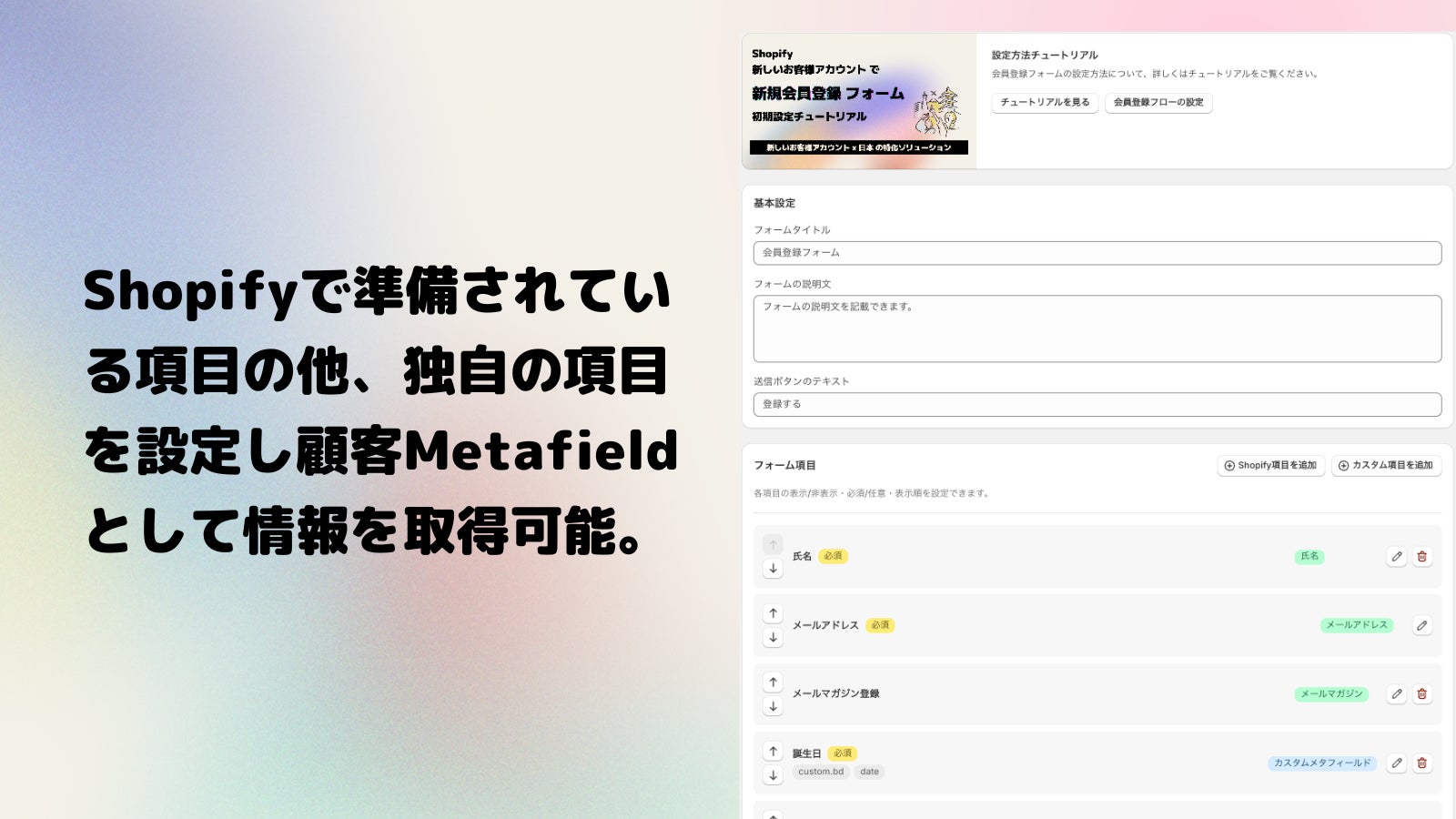 Shopify の新しいお客様アカウントへの移行に際して、会員登録フォームが使えなくなることへのご不安の声を、多くのShopifyストアオーナー様からいただいておりました。本アプリは、そういった声に応えるべく開発したものです。