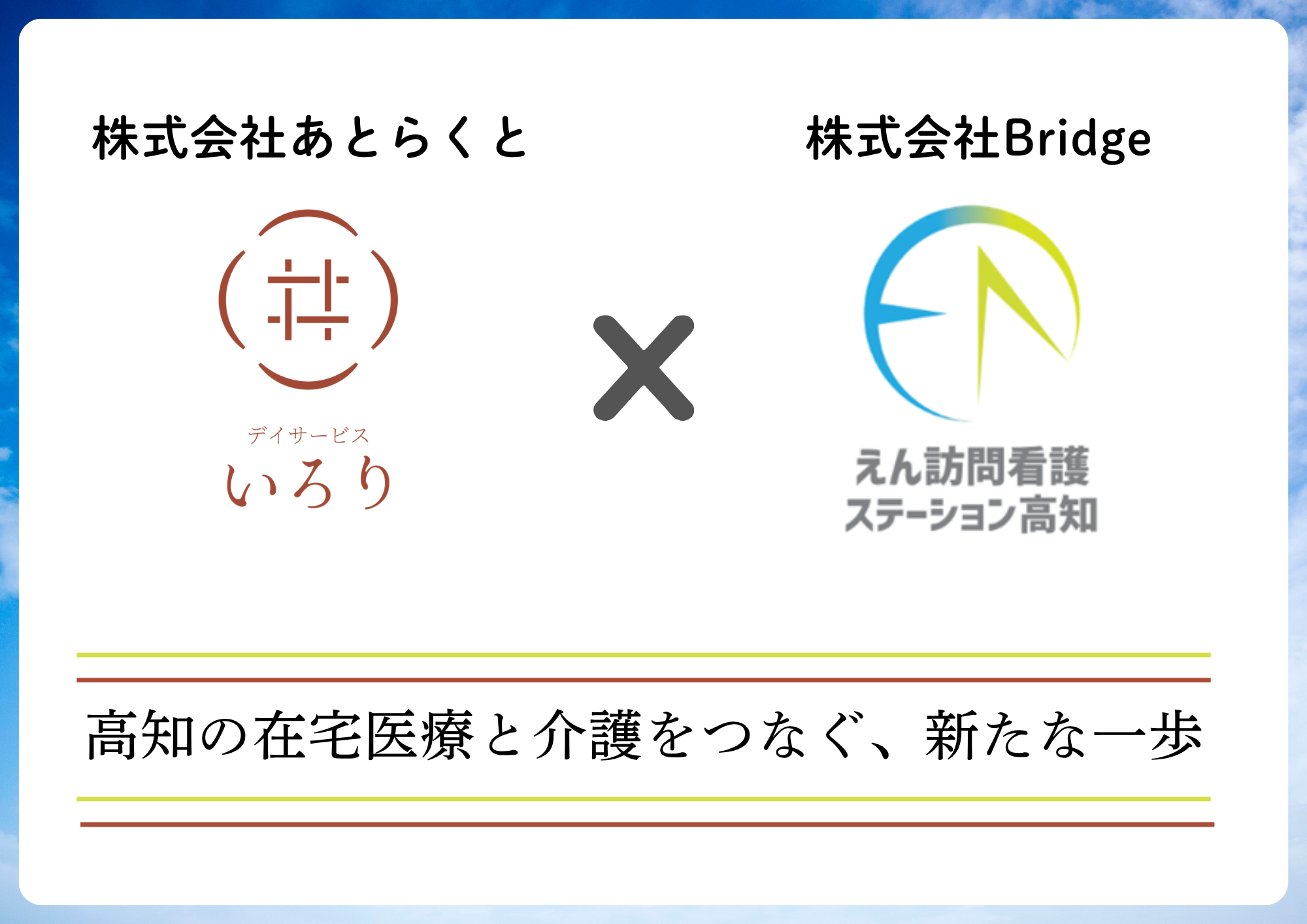 Bridgeは高知県内で訪問看護サービスを、あとらくとは地域に根ざした通所介護サービスを展開してきました。今回の統合により、訪問看護の専門性と通所介護の現場力を掛け合わせ、在宅から通所まで切れ目のない支援体制の構築を目指します。