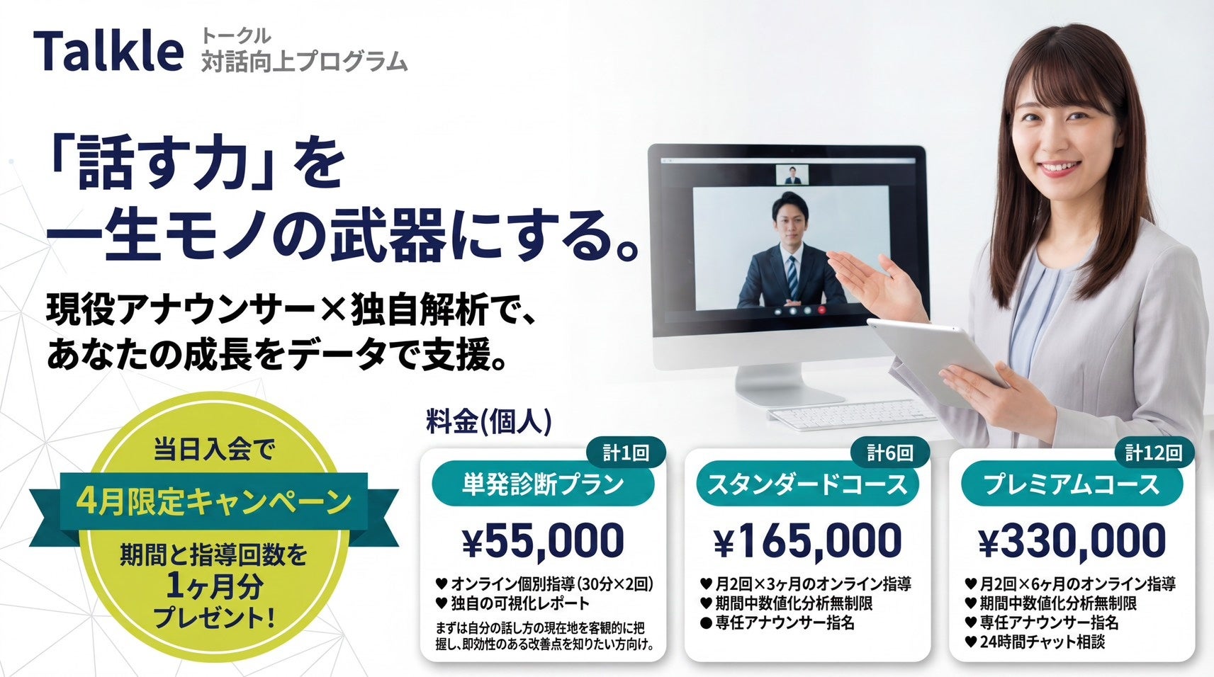 【現役アナウンサー×独自解析】対話向上プログラム「Talkle Scope」が4月より本格展開。新年度、本気で自分を変える「プラス1ヶ月」特典を提供!