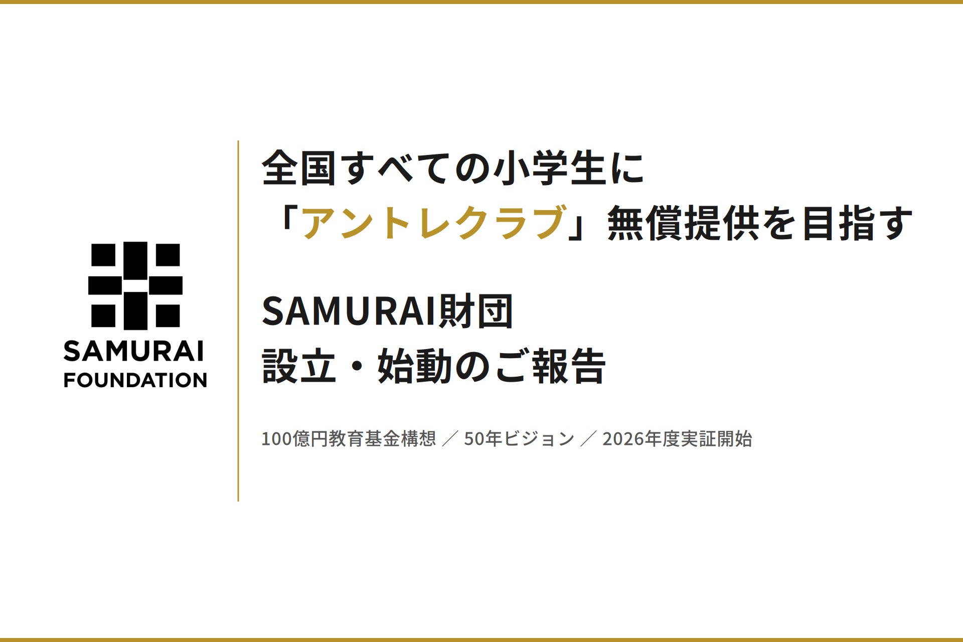 当財団は「できるできないでなく、やるかやらないかで世界を変える」をミッションに、全国すべての小学生に「SAMURAIアントレクラブ」を提供する50年ビジョンを発表します。小学5・6年生を対象とした課外型の起業教育プログラムを通じて、挑戦・協働・創造を軸とした次世代の人材育成に取り組みます。すべての小学生に無償で提供する教育インフラの構築を目指すものです。 2026年度より、まずは4〜6の小学校・エリアと提携し、パイロット版の提供と実証を開始します。