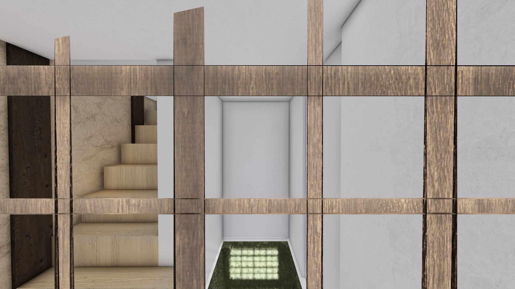 そこから階段を下り、1階の室Bへと進むと、床一面に広がるガラス越しに、半地下に設えられた庭が現れます。1階の室Bは、その半地下空間を“奥庭”として見立てて構成されており、床下に広がる庭と連続することで、視線はさらに奥へと導かれていきます。視覚的な広がりとともに、空間は次第に内側へと閉じ、見るという行為から、感じるという体験へと移行していきます。