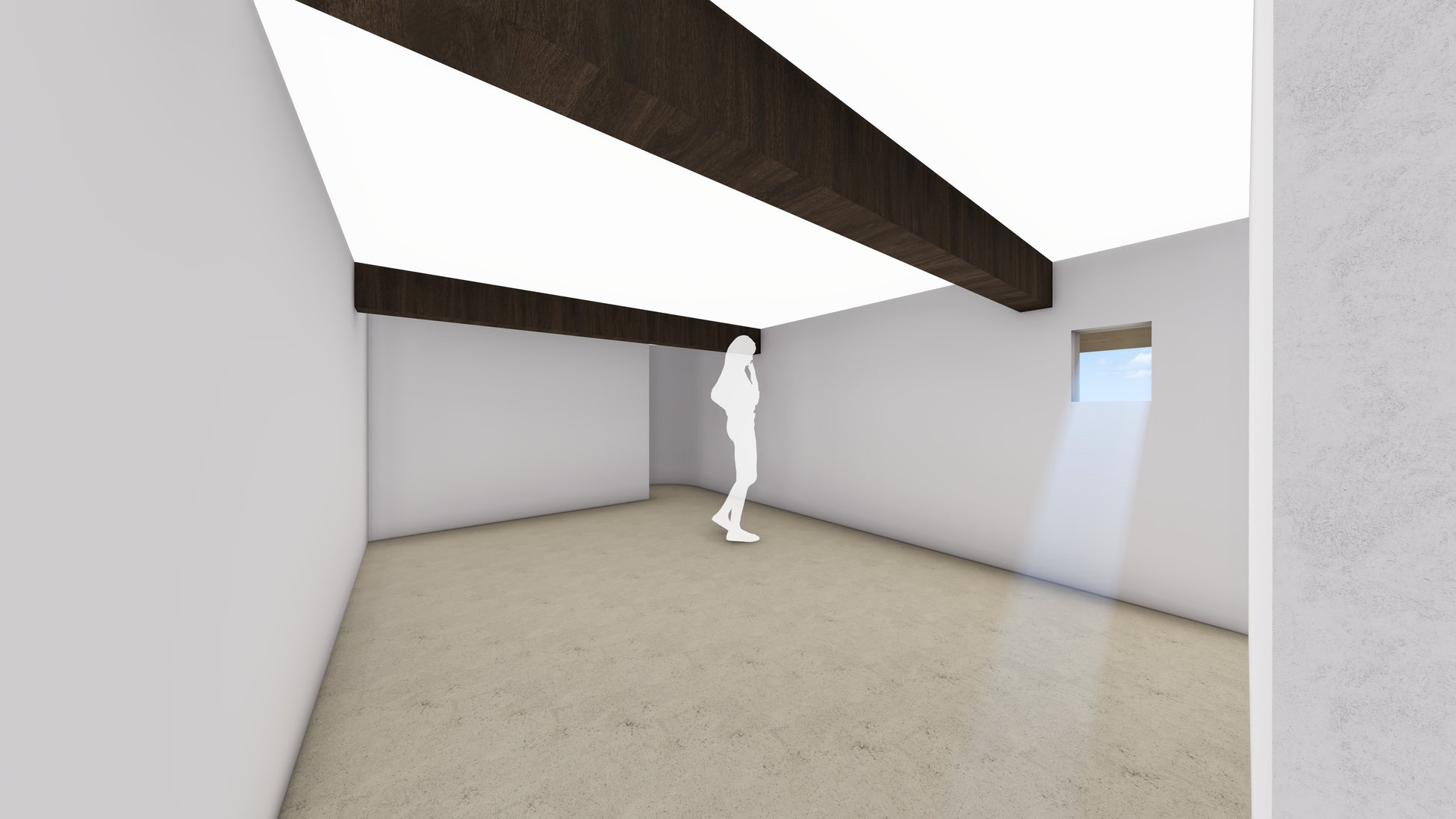 来訪者は、通りから一歩奥へと進み、玄関(前庭)から建物内部へと導かれたのち、2階へと上がります。上層となる2階の室Aは、白い壁と天井によって構成された抽象的な空間で、均質な光が展示物の輪郭を静かに浮かび上がらせます。