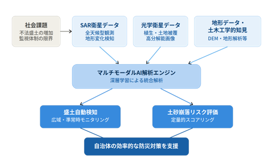 本事業では、複数の衛星データとAI技術を組み合わせ、広域にわたる盛土の自動検知と、検知された盛土の土砂崩落リスクを定量的に評価するシステムを開発します。自治体の調査ニーズに応じた複数の検知モードを備え、天候条件に左右されにくい安定的な監視体制の構築を目指します。