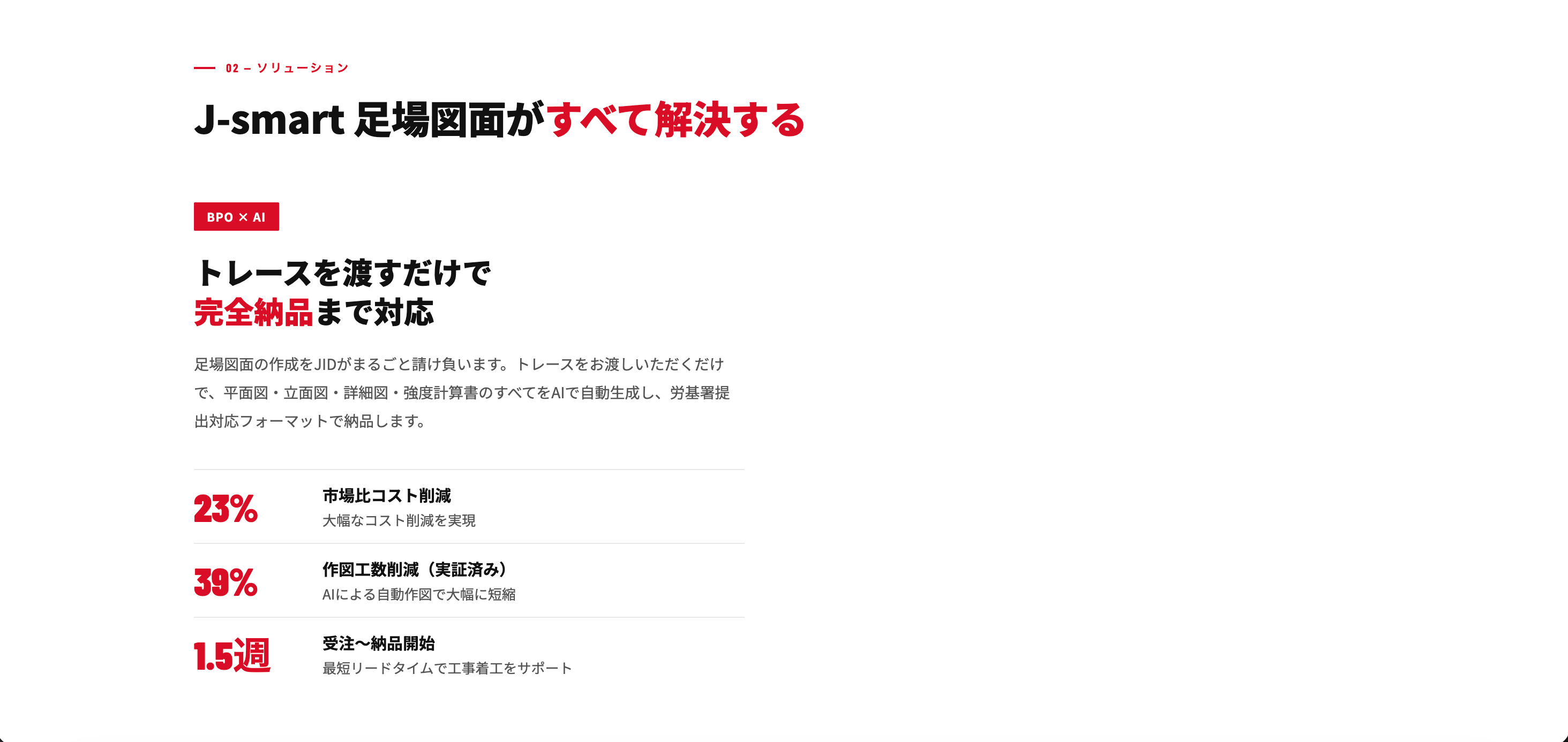 株式会社J.I developer(本社:神奈川県横浜市西区みなとみらい、代表取締役CEO:嶋﨑 大輔、以下「JID」)は、足場図面をAIで自動生成するBPOサービス「J-smart 足場図面(通称:ジェイスマ)」を2026年4月に正式ローンチいたしました。サービス開始以降、平均して1日1社ペースで新規取引登録が進行しており、足場業界が抱える構造的課題の解決に向けて確かな手応えを得ています。