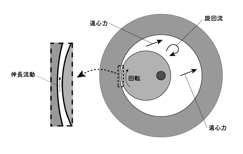 独自の「円筒ロータ機構」: 従来のスクリュー式やブレード式とは全く異なる独自の構造(特許出願中)を採用。円筒ロータによる高速回転が、混練炉内に強力な剪断(せんだん)力を発生させます。
