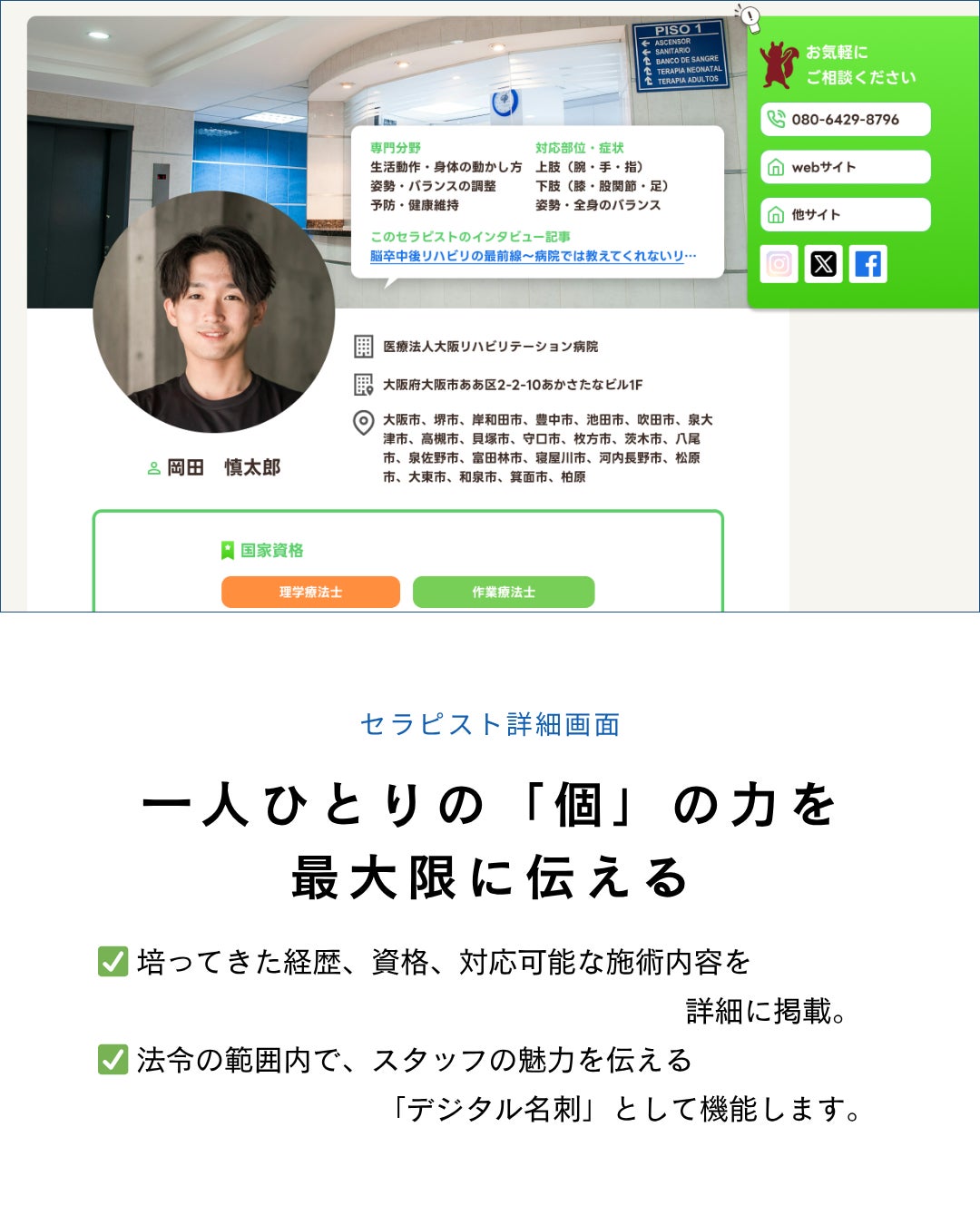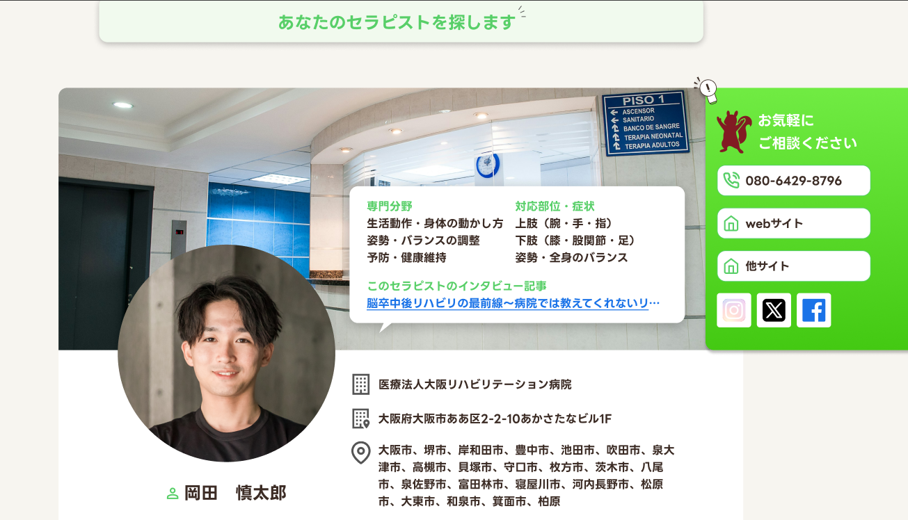 個人事業主として活動するセラピストの場合は、個人のビジネス用連絡先が表示され、ダイレクトな集客・連携が可能です。