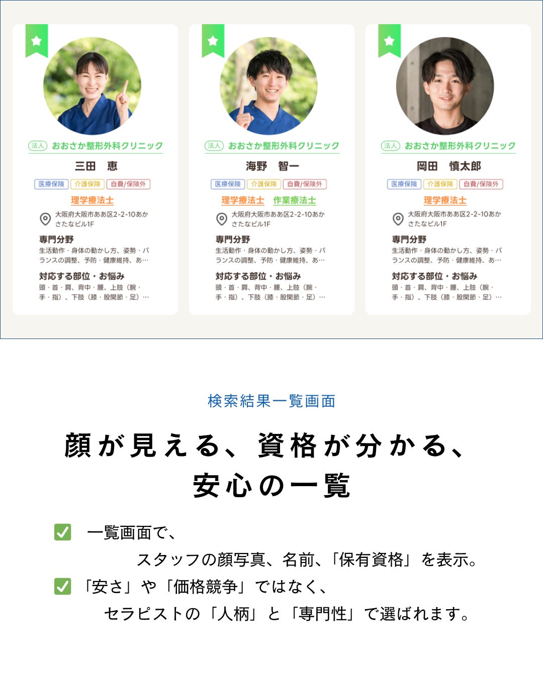 地域の事業所は、これまで自社サイトでは表現しきれなかったスタッフの学会認定資格や、自費リハビリ(自由診療)のメニューなどを、ガイドライン違反の恐怖に怯えることなく堂々と公開できます。ケアマネジャーや病院からの信頼を獲得し、事業所の「選ばれる理由」を創出します。