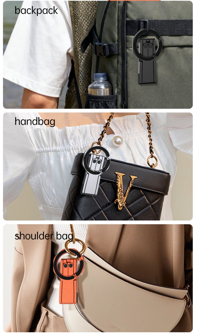 カラビナ風フックデザインで、バッグやベルトにサッと吊り下げられます。コンパクトサイズなので持ち運びも軽快で、旅行や外出先でも、いつでもどこでもすぐに撮影を開始できます。