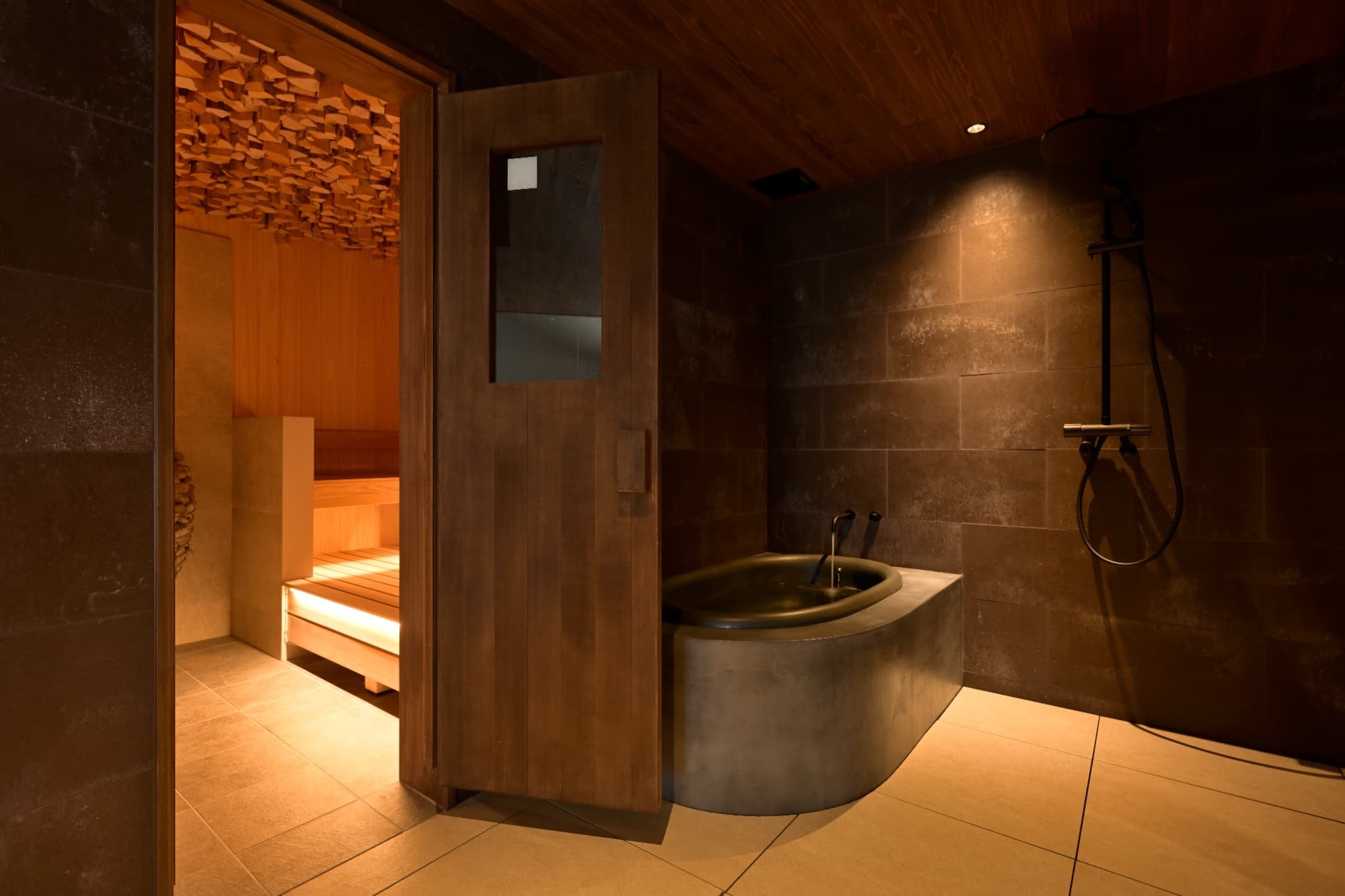 スイートルーム(room E・F)にはプライベートサウナを備え、客室と外部空間がゆるやかにつながる設計のもと、外気浴までを含めた一連の体験をお楽しみいただけます。開放感のある空間の中で、日常から解き放たれる上質なひとときをお過ごしください。