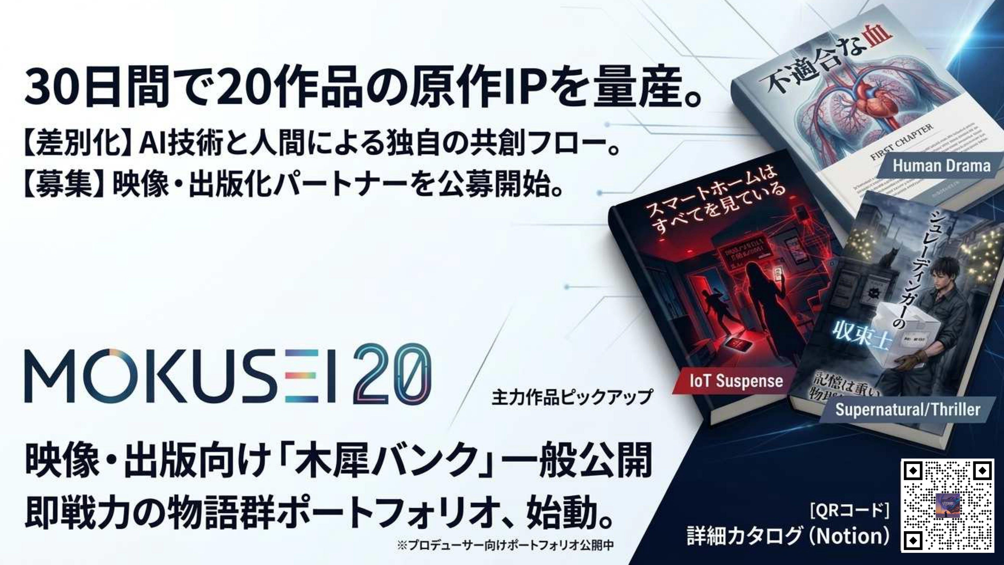 本プロジェクト「MOKUSEI 20」から生まれた「木犀原作バンク」は、現代社会の歪み、テクノロジーの光と影、人間の深層心理をテーマにした多角的な物語群であり、即戦力の原作IP(知的財産)として設計されています。