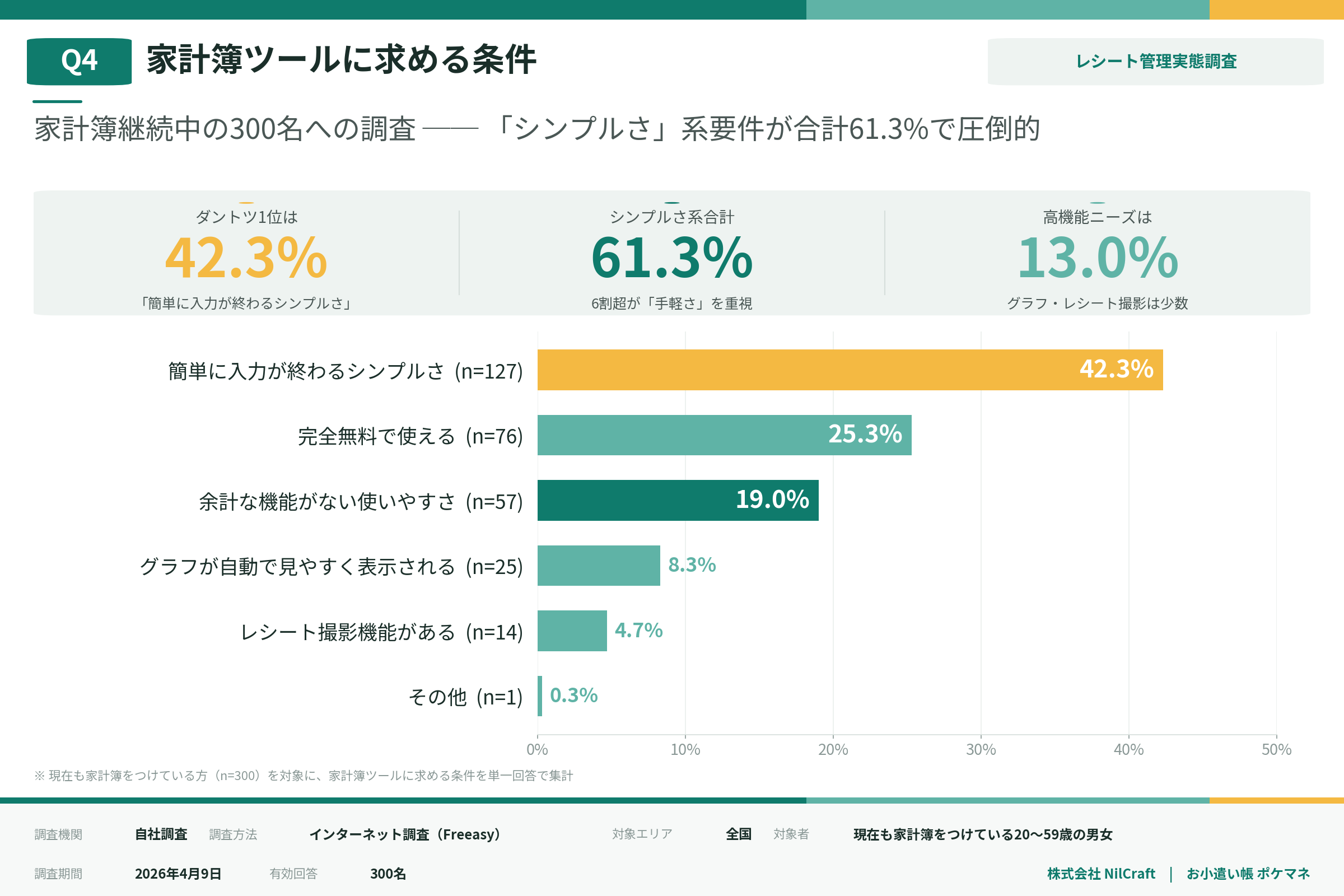 最も多く選ばれた条件は「簡単に入力が終わるシンプルさ」で42.3%(127名)と、2位以下を大きく引き離す結果となりました。続いて「完全無料で使える」が25.3%(76名)、「余計な機能がない使いやすさ」が19.0%(57名)、「グラフが自動で見やすく表示される」が8.3%(25名)、「レシート撮影機能がある」が4.7%(14名)と続いています。