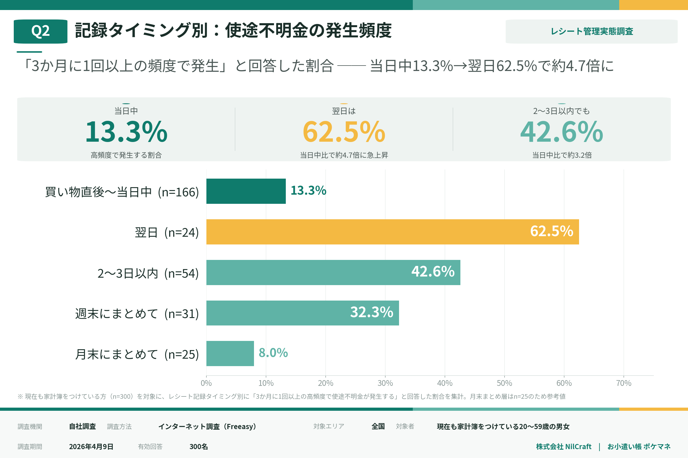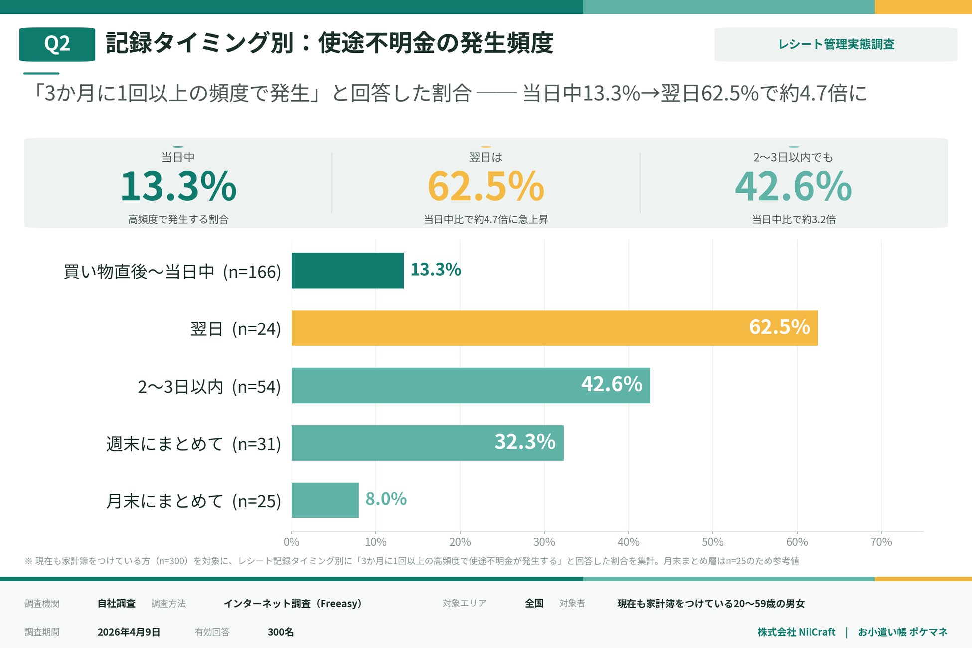 記録のタイミングがわずか1〜2日ずれるだけで、使途不明金の発生率に大きな差が生まれていることがわかります。レシートを記録するまでの時間が長くなるほど、買い物内容の記憶が薄れ、結果として家計管理の精度が低下するという構造が、データから明確に読み取れます。