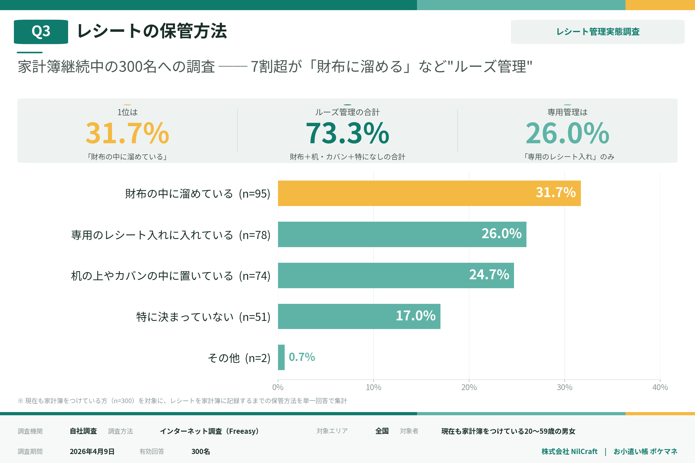 最も多かった回答は「財布の中に溜めている」で31.7%(95名)、次いで「専用のレシート入れに入れている」が26.0%(78名)、「机の上やカバンの中に置いている」が24.7%(74名)、「特に決まっていない」が17.0%(51名)と続きました。