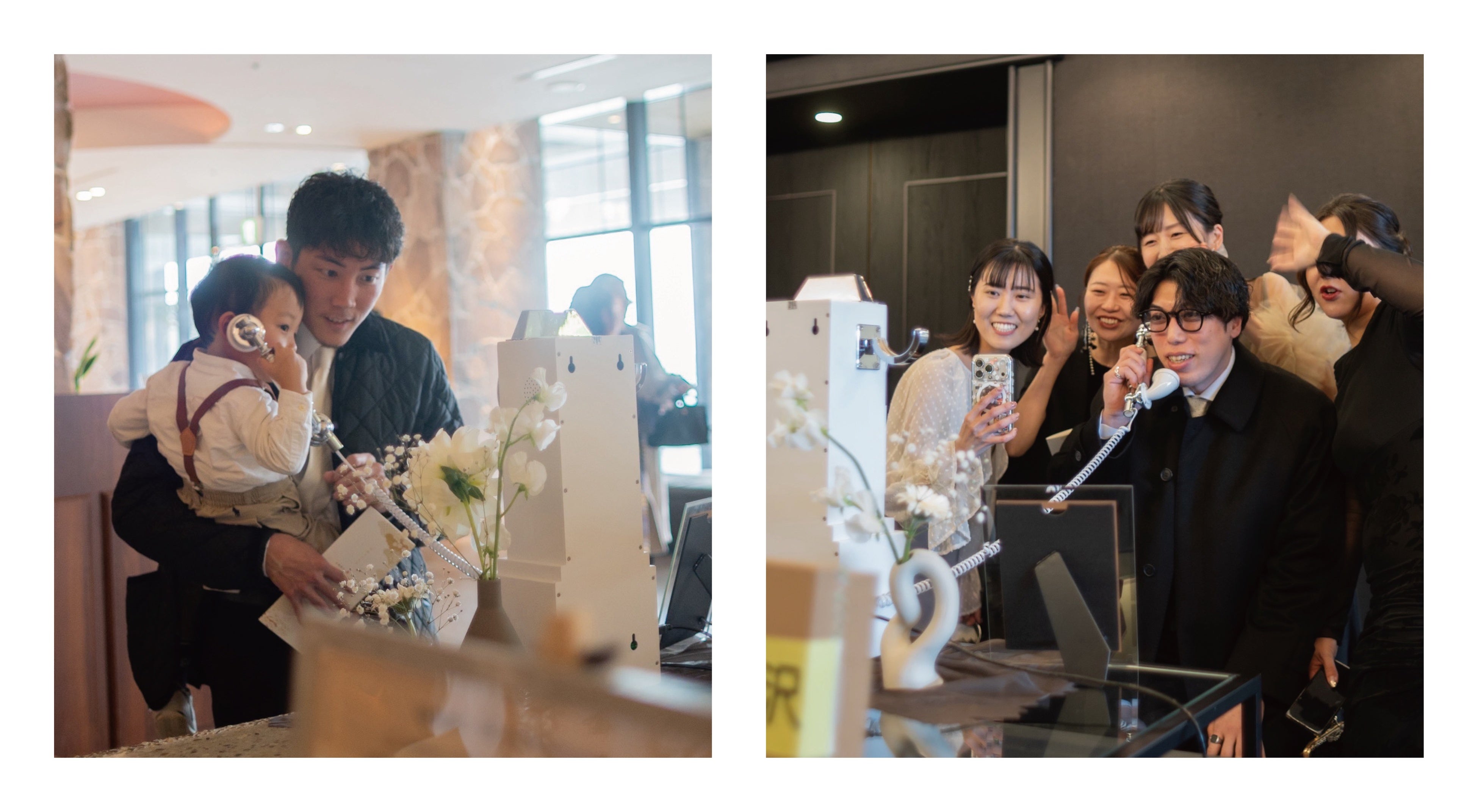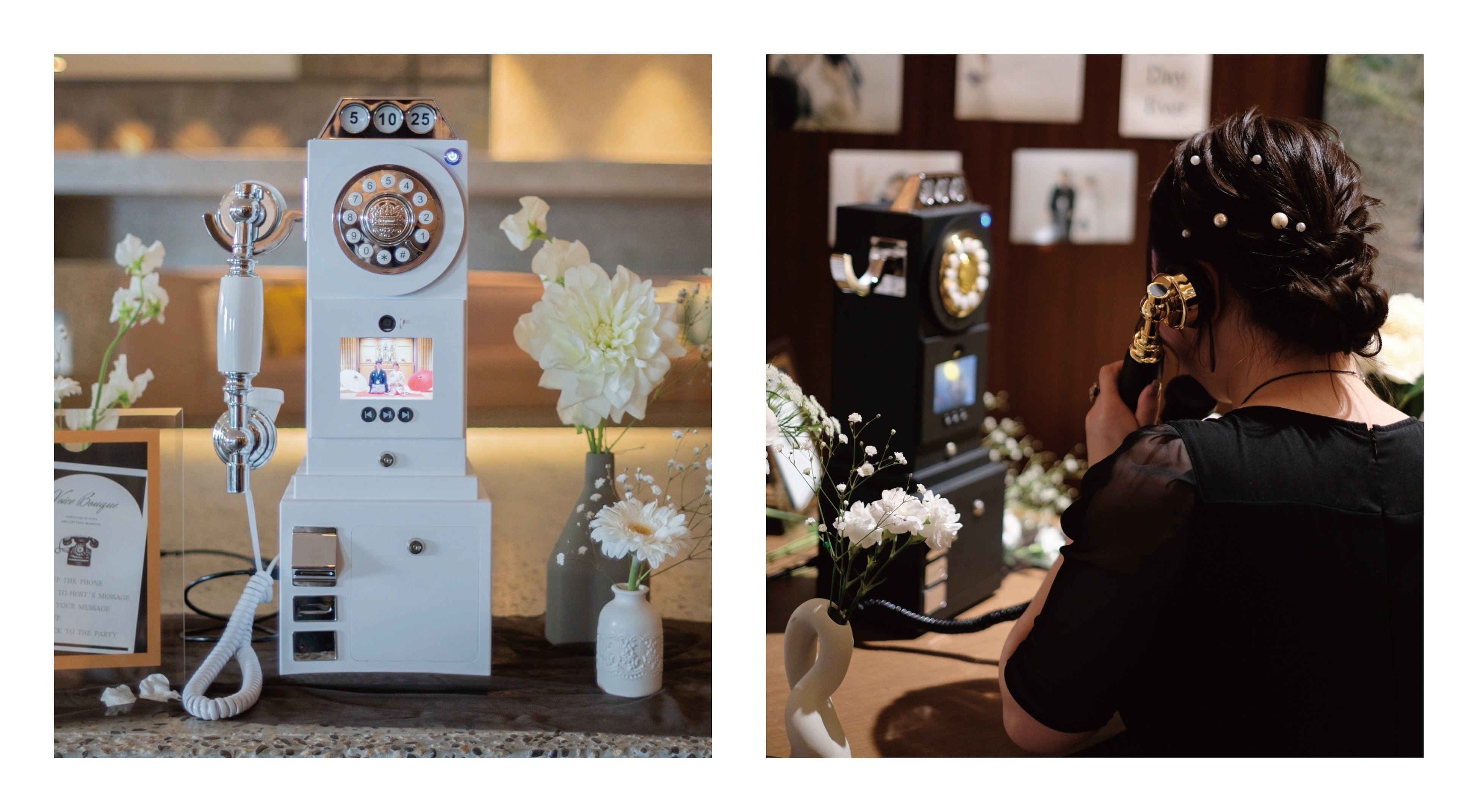 「anone」は、電話機をウェルカムスペースや式場内に設置し、ゲストが受話器を取って話すだけで、録音・録画が自動で開始される体験型サービスです。