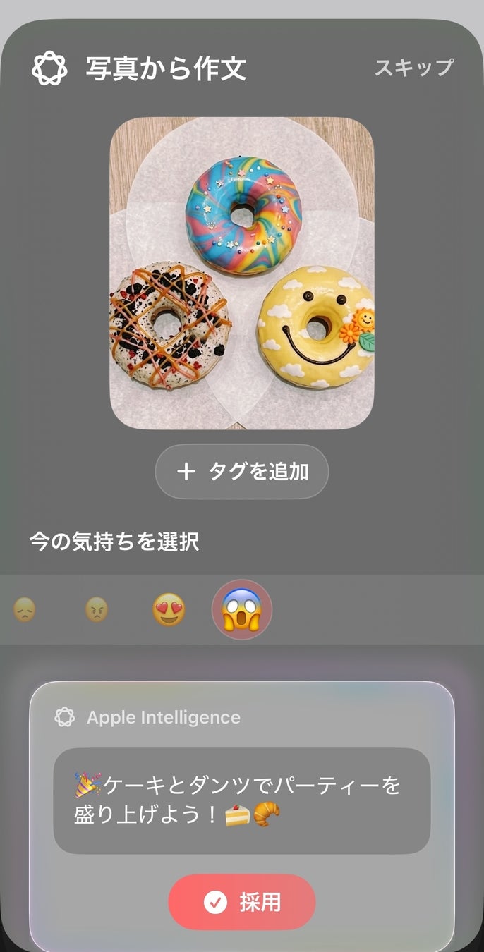 Appleが提供するパーソナルインテリジェンスシステム「Apple Intelligence」を活用し、風景を撮って絵文字で気分を選ぶだけでAIが言葉に変えます。わずか4タップで街歩きを妨げない投稿が可能です。