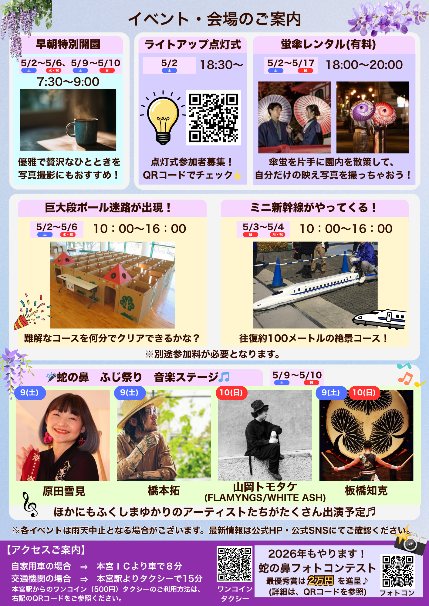 各種イベントは天候や花木の開花状況によって変更となる場合がございます。 最新情報は公式ホームページまたは公式SNSをご覧ください。 |