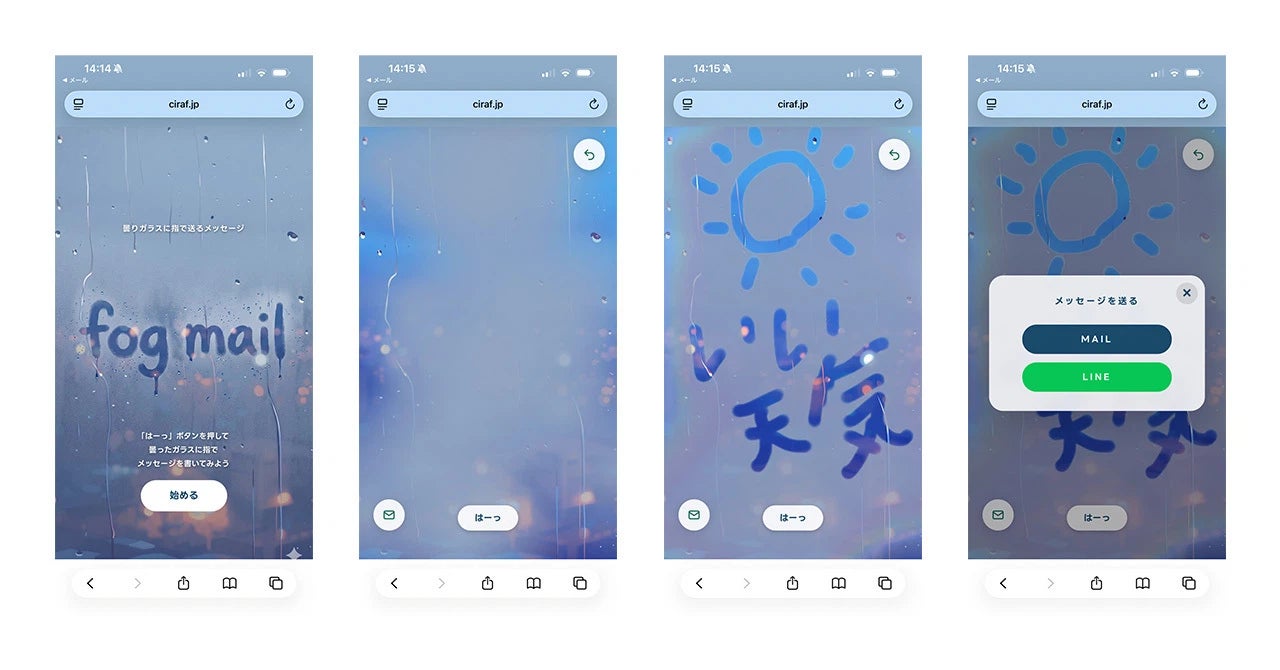 「fog mail」は、スマートフォンのブラウザ上で、結露した窓ガラスに息を吹きかけ、指でメッセージを書いて送ることができるWebアプリです。