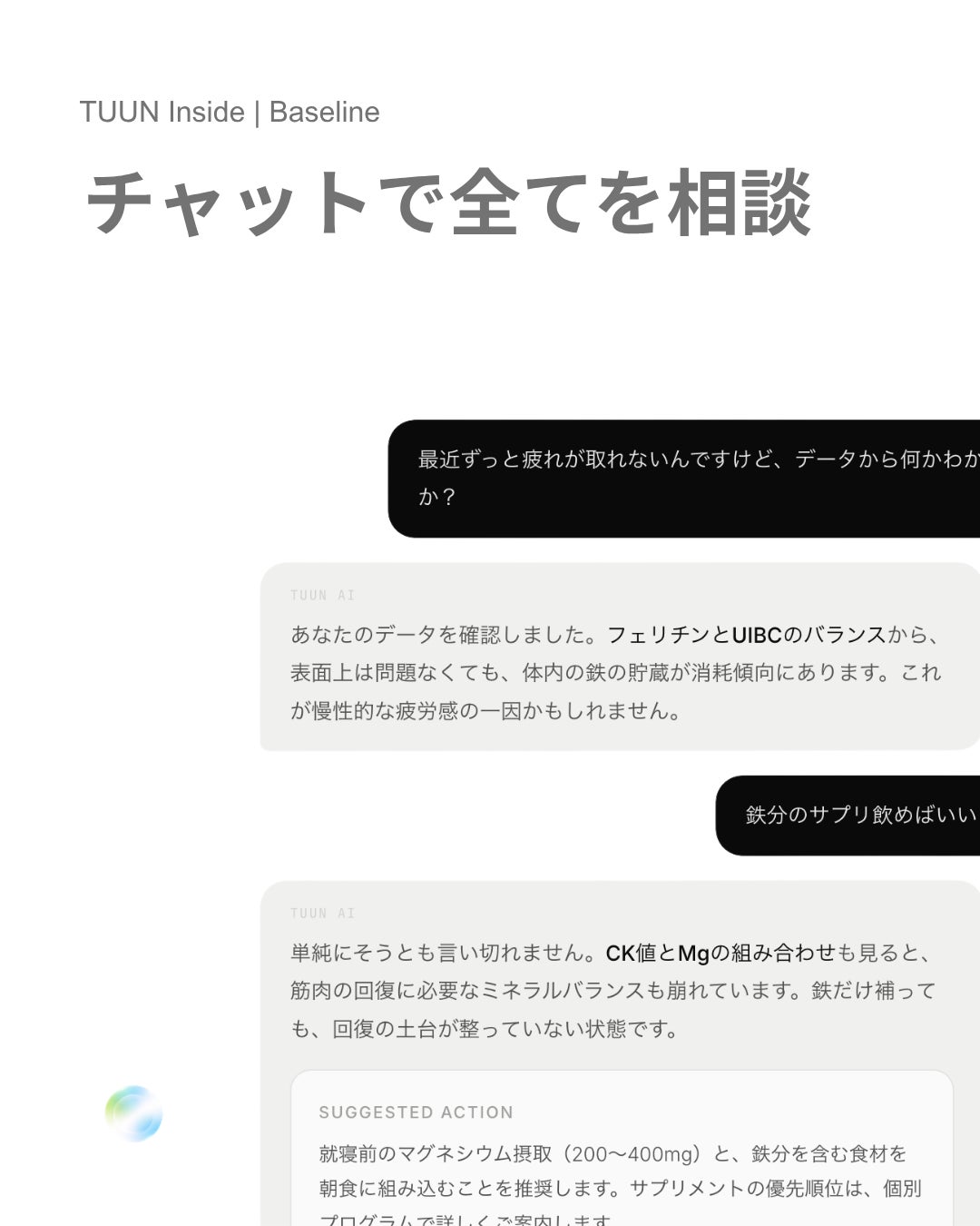 TUUNは、遺伝子・血液・バイタルデータ(Apple Watch、Oura Ring、Soxai等)・サプリメント・服薬情報を一つのAIに統合。ユーザーの体質と日々の変化を24時間理解し続けるエージェントが、「なんとなくだるい」「理由のわからない不調」といった曖昧な悩みから、ダイエット・疲労回復・睡眠・運動まで、一人ひとりに最適化された答えを能動的に提案します。