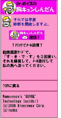 モバイル・コンテンツの先駆者としての実績を活かし、総合的なプロデュースを手がけるインデックスでは、音声解析技術を利用し人の「声」をもとに様々な診断が出来る“モバイル診断サービス” 「ヒトコエ」(http://hitokoe.jp/)のサービスを提供しています。声からリアルな“えっち度”が分かる「えっちしんだん」をはじめ、人の“秘めた内面”を診断する「声ヂカラしんだん」、“恋愛成功度”を診断する「胸キュンしんだん」を展開しています。
