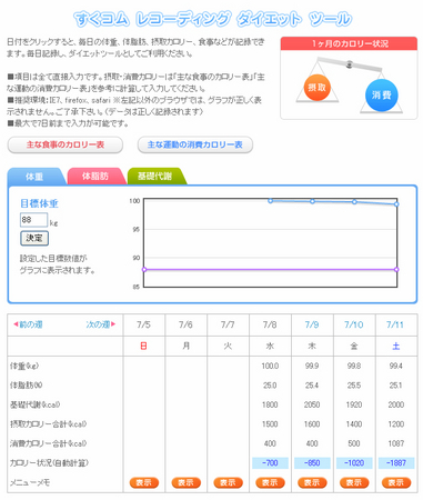 すくすく.COMのサイト上に、毎日の体重・体脂肪率・摂取カロリー・代謝カロリーを記録できるツールを設置。このツールを使って毎日記録をつけ、食事や運動など普段の生活における改善点を見出すことにより、ダイエットに役立てていただくことができます。記録ツールは、すくすく.COMに会員登録(無料)することで、利用できます。